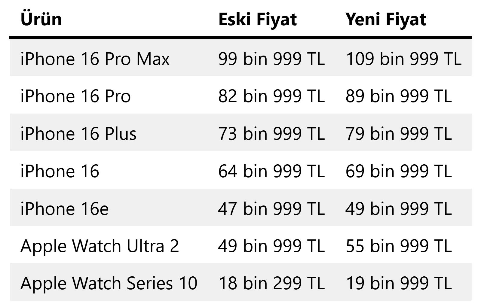 Apple, Türkiye'de satılan ürünlerine zam yapma kararı aldı. Peki, zammın ardından en pahalı iPhone ne kadar oldu? İşte detaylar.. Döviz kurlarındaki artışın ardından Apple Türkiye’deki ürünlerine zam yapma kararı aldı. Yeni fiyat listesine göre iPhone 16 Pro’nun başlangıç fiyatı 82 bin 999 TL’den 89 bin 999 TL’ye, 16 Pro Max’in fiyatı ise 99 bin 999 TL’den 109 bin 999 TL’ye yükseldi. Zammın ardından 16 Pro Max’in 512 GB modeli 120 bin 999 TL'ye, 1 TB modeli ise 131 bin 999 TL'ye çıktı. iPhone 16 69 bin 999 TL, 16 Plus ise 79 bin 999 TL'den başlayan fiyat etiketiyle satılmaya başlandı. Seriye sonradan eklenen iPhone 16e’nin başlangıç fiyatı ise 49 bin 999 TL olarak güncellendi. iPhone dışındaki ürünlere de zam geldi Son zamlarla birlikte Apple, iPhone ürünlerinin yanında diğer ürünlerinin fiyatını da güncelledi. Apple Watch Series 10 artık 19 bin 999 TL, Watch Ultra 2 ise 55 bin 999 TL’den satışa sunulmaya başlandı. Mac ve iPad kategorilerinde şu an için bir fiyat güncellemesi yapılmadı fakat döviz kurundaki hareketliliğin devam etmesiyle bu ürünlere de zam gelebileceği tahmin ediliyor. Kaynak: ShiftDelete [news_id:763195]