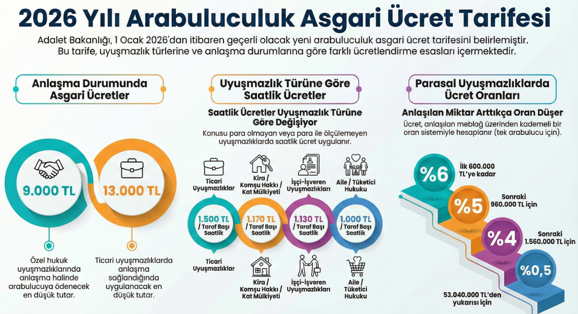 Adalet Bakanlığı tarafından hazırlanan "2026 Yılı Arabuluculuk Asgari Ücret Tarifesi" ile arabuluculuk ücretlerinde alt sınırlar belirlenirken, kira uyuşmazlıklarından ticari davalara kadar pek çok alanda uygulanacak ödeme kalemleri netleşti. Resmi Gazete'de yayımlanan ve 1 Ocak 2026 itibarıyla yürürlüğe girecek olan tarifeye göre, özel hukuk uyuşmazlıklarının çözümü için arabuluculara ödenecek asgari tutarlar ve uygulama esasları yeniden düzenlendi. Yeni tarifeye göre, arabuluculuk süreci sonunda tarafların anlaşmaya varması durumunda, uyuşmazlık konusunun bedeline bakılmaksızın arabulucuya ödenecek ücret 9 bin liradan az olamayacak. Ticari uyuşmazlıklar ile ortaklığın giderilmesine ilişkin uyuşmazlıklarda ise anlaşma sağlanması halinde bu tutar en az 13 bin lira olarak uygulanacak. Kira ve tahliye uyuşmazlıkları Milyonlarca vatandaşı yakından ilgilendiren kira uyuşmazlıklarında da yeni ücreliraer belirlendi. Buna göre anlaşma sağlanması halinde; Tahliye talepli uyuşmazlıklarda, bir yıllık kira bedeli tutarının yarısı üzerinden, kira tespiti uyuşmazlıklarında, tespit olunan kira bedeli farkının bir yıllık tutarı üzerinden tarifenin ikinci kısmındaki oranlara göre ücret hesaplanacak. Taraflardan birinin aynı olduğu ve bir ay içinde yapılan en az 10 başvuruyu kapsayan "seri uyuşmazlıklarda" anlaşma sağlanması durumunda; arabulucu her bir uyuşmazlık için ticari davalarda 7 bin 500 lira, diğer uyuşmazlıklarda ise 6 bin lira ücret alacak. Tebliğde, dava şartı (zorunlu) arabuluculuk sürecine ilişkin kritik detaylara da yer verildi. Arabulucu, dava şartı sürecinde taraflardan masraf talep edemeyecek. Sehven kayıt, mükerrer kayıt veya uyuşmazlığın arabuluculuğa elverişli olmaması nedeniyle sona eren dosyalarda arabulucuya ücret ödenmeyecek. Anlaşma sağlanamaması durumunda, konusu para olan uyuşmazlıklarda dahi arabulucu ücretini tarifenin birinci kısmındaki (saatlik/sabit) kalemler üzerinden isteyebilecek. Aksi kararlaştırılmadıkça arabuluculuk ücreti taraflarca eşit şekilde karşılanacak. Tarifede belirlenen ücreliraerin altında bir rakam kararlaştırılamayacak; aksi yöndeki sözleşmeler geçersiz sayılacak. Arabuluculuk faaliyeti sırasında yeni uyuşmazlık konularının ortaya çıkması halinde, her bir yeni konu için ayrı ücrete hak kazanılacak. Ancak bu hüküm, dava şartı kapsamındaki anlaşmazlık durumlarında uygulanmayacak. Söz konusu tarife hükümleri, arabuluculuk faaliyetinin sona erdiği tarihteki güncel rakamlar üzerinden esas alınacak. Ticari uyuşmazlıklarda saatlik ücret 1500 lira oldu Yayımlanan tarifeye göre, konusu para olmayan veya para ile değerlendirilemeyen hukuki uyuşmazlıklarda arabulucuya ödenecek saatlik ücreliraer, taraf sayısına göre değişiklik gösteriyor. Bu kapsamda; Aile Hukuku, Tüketici Hukuku ve diğer tür uyuşmazlıklarda; 2 kişinin taraf olması durumunda taraf başına saatlik 1000 lira. Ticari uyuşmazlıklarda; 2 kişinin taraf olması durumunda taraf başına saatlik 1500 lira. İşçi-işveren uyuşmazlıklarında; 2 kişinin taraf olması durumunda taraf başına saatlik 1130 lira. Kira, Komşu Hakkı ve Kat Mülkiyeti Kanunu'ndan kaynaklanan uyuşmazlıklarda; 2 kişinin taraf olması durumunda taraf başına saatlik 1170 lira ödeme yapılacak. Taraf sayısının artması durumunda (3-5 kişi, 6-10 kişi veya 11 ve daha fazla) ödenecek toplam saatlik ücreliraer de kademeli olarak artış gösterecek. Özellikle son dönemde yoğun ilgi gören kira uyuşmazlıkları ile ortaklığın giderilmesi (izale-i şuyu) uyuşmazlıklarında, taraf sayısı 2 kişi ise saatlik ücret taraf başına 1170 lira olarak uygulanacak. Taraf sayısının 11 ve daha fazla olması durumunda bu uyuşmazlık türleri için ödenecek toplam saatlik ücret 2740 lira olarak belirlendi. Konusu para olan veya para ile değerlendirilebilen hukuki uyuşmazlıklarda, arabuluculuk süreci sonunda üzerinde anlaşılan miktar üzerinden alınacak ücreliraer ise şu şekilde açıklandı: İlk 600.000 lira için; Bir arabulucu görev yaparsa yüzde 6, birden fazla arabulucu görev yaparsa yüzde 9. Sonra gelen 960.000 lira için; Bir arabulucu görev yaparsa yüzde 5. Sonra gelen 1.560.000 lira için; Bir arabulucu görev yaparsa yüzde 4. 53.040.000 lira'den yukarısı için ise; Bir arabulucu görev yaparsa yüzde 0,5 oranında ücret ödenecek. Tarifeye göre, anlaşılan miktar arttıkça arabuluculuk ücret oranı kademeli olarak düşecek. Yeni tarife hükümleri, 1 Ocak 2026 itibarıyla derdest olan (devam eden) dosyalar da dahil olmak üzere uygulanmaya başlanacak.