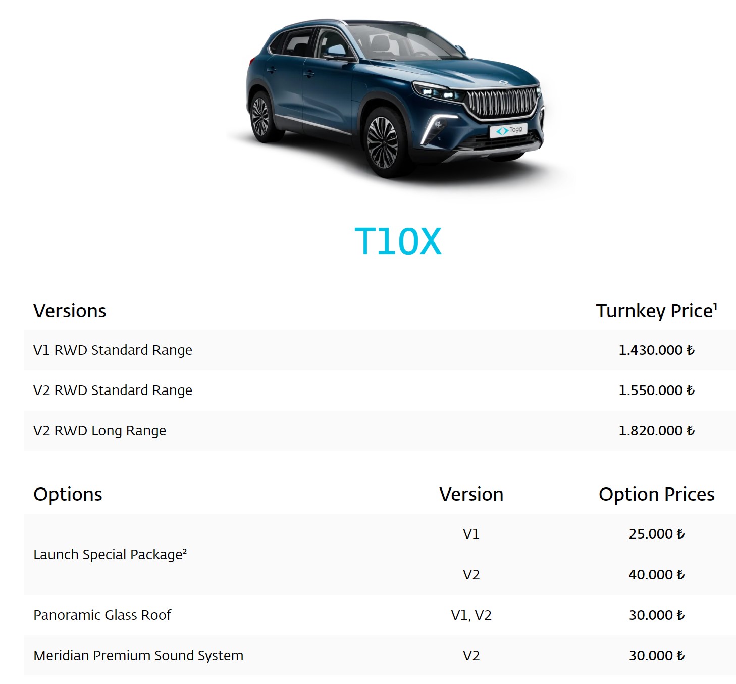 Türkiye'nin yerli ve milli otomobili Togg için yeni bir fiyat düzenlemesine gidildi. Buna göre Togg T10X modelinde ortalama %16,5 zam gerçekleştirildi. Elektrikli araçların pazar payının artışını sürdürdüğü son günlerde sektöre yönelik düzenlemeler hız kazanmıştı. Buna göre son olarak motor gücü 160 kilovatın altında ve yüzde 10 özel tüketim vergisine tabi sadece elektrikli otomobiller için esas alınan matrah eşiği 1 milyon 250 bin liradan 1 milyon 450 bin liraya yükseltilmişti. Yeni düzenleme ise 1 milyon 250 bin altında kalan ve ÖTV dilimi nedeniyle fiyat artıramayan elektrikli araçlarda 200 bin liralık fiyat artışının önünü açmıştı. [news_id:715176] Bu kapsamda Türkiye'nin yerli ve milli otomobili Togg’un fiyatları da aralık ayının ilk günü itibarıyla güncellendi. Kaynak: TOGG Buna göre V1 RWD Standart Menzil fiyatı 1 milyon 227 bin 500 liradan 1 milyon 430 bin liraya, V2 RWD Standart Menzil 1 milyon 329 bin 500 liradan 1 milyon 550 bin liraya, V2 RWD Uzun Menzil'in fiyatı ise 1 milyon 563 bin 500 liradan 1 milyon 820 bin liraya yükseldi. Böylelikle Togg'un T10X modeline ortalama olarak yüzde 16,50 oranında zam geldi.