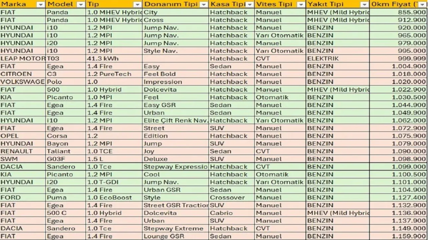 Türkiye otomotiv sektörü, yıl sonu kampanyalarıyla birlikte hareketli bir dönem geçiriyor. Listede öne çıkan modeller arasında Fiat Panda, Hyundai i10 ve Hyundai i20 gibi modeller yer alıyor. Özellikle Fiat Panda'nın City ve Cross versiyonları, 855.900 TL'den başlayan fiyatlarla satışa sunulmuş durumda. Hyundai i10 ve i20 ise çevre dostu hibrit motor seçenekleri ve rekabetçi fiyatlarıyla dikkat çekiyor. Yeni araçlarda hibrit teknolojisinin yaygınlaşması, ekonomik ve çevre dostu otomobillerin ön plana çıkmasını sağladı. Listede yer alan araçların çoğu, hafif hibrit motor teknolojisine sahip. Bu modeller, düşük emisyon değerleri ve yakıt tasarrufları ile çevreye duyarlı bir seçenek sunuyor. Fiat Panda gibi araçlar, uygun fiyatlarının yanı sıra şehir içi kullanım için ideal kompakt tasarımlarıyla da öne çıkıyor. Otomotiv firmalarının hibrit motorlu araçlara yaptığı yatırımların, Türkiye'deki otomobil satışlarını artırdığı belirtiliyor. Cardata Genel Müdürü Hüsamettin Yalçın, Türkiye otomotiv pazarının yılın ilk 10 ayında 950 bin adet sıfır araç satışı gerçekleştirdiğini açıkladı. 2024 yılı sonunda bu sayının 1 milyonun üzerinde olmasının beklendiğini ifade etti. Geçen yıl kırılan 1,2 milyon adetlik Cumhuriyet tarihi rekoruna bu yıl da yaklaşılacağı öngörülüyor. Tüketicilerin araç alımını ertelemeyi istememesi, pazarın canlı kalmasına katkı sağlayan en önemli etkenlerden biri. Ayrıca döviz kurlarındaki artış beklentisi ve araçların yatırım aracı olarak görülmesi de bu talebi artırıyor. 1) Fiat Egea 1.4 Fire Easy benzinli 95 hp - 889.900 TL 2) Hyundai i10 1.2 MPI 79PS Jump + Nav. - 920.000 TL 3) Opel Corsa Edition 1.2 75 hp benzin manuel - 1.075.900 TL 4) Renault Taliant Joy 1.0 Turbo X-tronic 90 bg - 1.090.000 TL 5) MG ZS Comfort 1.0 AT 111 ps - 1.299.000 TL 6) Seat Ibiza 1.0 EvoTSI 115 hp Style DSG - 1.310.000 TL 7) Honda City 1.5L VTEC Benzin Otomatik - 1.330.000 TL 8) Suzuki Swift 1.2 MHEV CVT Life - 1.359.000 TL 9) Toyota Corolla 1.5 Vision Plus Multidrive S - 1.390.000 TL 10) Ford Puma SUV, 1.0L EcoBoost 125PS, 7 ileri Otomatik, Benzin Style - 1.385.600 TL 11) TOGG V1 RWD Standart Menzil - 1.432.600 TL 12) BYD DOLPHIN - 1.280.000 TL 13) Cupra Born - 1.890.000 TL 14) Alfa Romeo Tonale TI 1.6 Dizel, 130 hp, DCT - 2.140.000 TL 15) Audi A3 Sportback 35 Turbo FSI 150 bg Advanced S Tronic - 2.267.531 TL kaynak: ekonomist