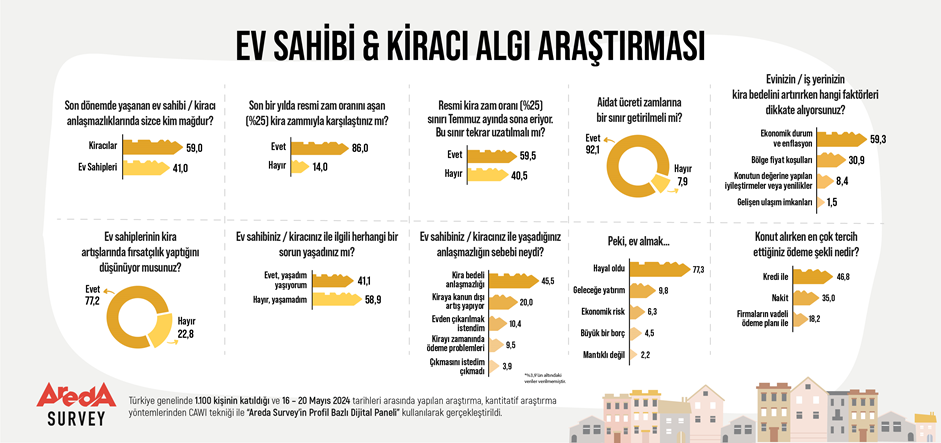 Areda Survey tarafından 1100 kişiyle yapılan araştırmaya göre kiracıların yüzde 86'sı son bir yılda resmi zam oranını aşan kira zamlarıyla karşılaştı. Areda Survey araştırma şirketi Türkiye genelinde 1100 kişinin katılımıyla gerçekleştirdiği araştırmanın sonuçlarını açıkladı. Buna göre, kiracıların yüzde 86'sı son bir yılda resmi zam oranını (yüzde 25) aşan kira zamlarıyla karşılaştığını ifade etti. Kiracı/ev sahibi tartışmalarında halkın yüzde 59'u kiracıların mağdur olduğunu düşünürken, anket katılımcılarının yüzde 92,1'i aidatlara resmi bir sınır getirilmesi gerektiğini söyledi. Araştırma, kiraya verdiği gayrimenkulü olanların yüzde 59,3'ünün kira bedelini arttırırken ekonomik durum ve enflasyonu dikkate aldığını, yüzde 30,9'unun gayrimenkulün fiyatını belirlerken bölgeyi baz aldığını, yüzde 8,4'ünün tadilat gibi iyileştirmelere dikkat ettiğini, yüzde 1,5'inin de ulaşım imkanlarını incelediğini ortaya koydu. Halkın yüzde 58,9'u ev sahibi veya kiracısıyla bir sorun yaşamadığını söylerken yüzde 41,1'i de sorun yaşadığını ifade etti. Ev sahibi ile sorun yaşayanların yüzde 45,5'i bu sorunun kaynağı olarak kira bedeli anlaşmazlığını, yüzde 20'si kiraya kanun dışı artış yapılmasını, yüzde 10,4'ü ev sahibinin kendisini çıkarmak istemesini gerekçe gösterdi. Artan konut fiyatlarının ardından Türk halkının yüzde 9,8'i ev sahibi olmayı geleceğe bir yatırım olarak görürken yüzde 6,3'üne göre ev sahibi olmak ekonomik bir risk teşkil ediyor. Yüzde 4,5 katılımcı, ev sahibi olmayı büyük bir borç olarak tanımlarken, katılımcıların yüzde 2,2'si ise bu adımın mantıklı olmayacağını düşünüyor. Katılımcıların yüzde 46,8'i konut sahibi olurken başvuracakları ödeme yönteminin kredi çekmek olduğunu belirtiyor. Yüzde 35'i nakit ödeme yöntemi ile ev sahibi olmayı tercih ederken yüzde 18,2'si firmaların vadeli ödeme planı ile ev sahibi olmayı tercih edeceğini belirtiyor. Kaynak: Areda Survey Türkiye genelinde bin 100 kişinin katıldığı 16 - 20 Mayıs tarihleri arasında yapılan araştırma, kantitatif araştırma yöntemlerinden CAWI tekniği ile 'Areda Survey'in Profil Bazlı Dijital Paneli' kullanılarak gerçekleştirildi. Şimşek: Devamı için sebep yok Hazine ve Maliye Bakanı Mehmet Şimşek ise kirada yüzde 25 sınırının devam etmesi için bir sebep olmadığını düşündüğünü belirterek, şunları söylemişti: "Devam etmesi için ben bir sebep görmüyorum. Etmemesi gerektiğini düşünüyorum. Devam etmesi yönünde yapılan bir çalışma yok. Zaten bir süreliğine o düzenleme yapılmıştı. Çok büyük ihtimalle devam etmez diye düşünüyorum. Piyasada fiyatlara müdahale edilmemesi gerektiğine inanıyorum." [news_id:733848]