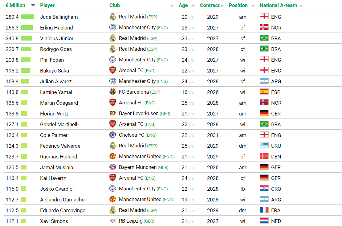Uluslararası Spor Araştırmaları Merkezi (CIES), futbol piyasasında transfer değeri en yüksek futbolcuları sıraladı. Real Madrid forması giyen Arda Güler, ilk 100'e giren tek milli futbolcu oldu. Avrupa liglerinde sezonlar sona ererken gözler yaklaşan transfer sezonuna çevrildi. Uluslararası Spor Araştırmaları Merkezi (CIES) de küresel çapta en değerli 100 futbolcuyu listeledi. CIES tarafından oluşturulan listede, Real Madrid'de forma giyen milli futbolcumuz da yer aldı. Bu sezon şans bulduğu 12 lig maçında 6 gol atan 19 yaşındaki yıldız isim, piyasa değerini de yükseltirken, Uluslararası Spor Araştırmaları Merkezi tarafından en değerli 100 futbolcu arasında gösterildi. Piyasa değeri 67,9 milyon euro olarak gösterilen Arda Güler, 100 futbolcu arasında 90. sıradan kendisine yer buldu. En değerli 100 futbolcunun bulunduğu listede ülkemizden başka futbolcu yer almadı. [news_id:699795] Listedeki en değerli 20 futbolcu ise şöyle sıralandı: Kaynak: CIES Weekly Post Listeye göre İngiliz Jude Bellingham şu anda dünyada transfer piyasasında en yüksek değere sahip oyuncu konumunda. CIES tarafindan yapılan değerlendirmeye göre, Real Madrid'deki başarılı ilk sezonunun ardından Şampiyonlar Ligi finaline sadece birkaç gün kala, adil fiyatı şu anda 280 milyon €'ya ulaştı. Manchester City'nin forveti Erling Haaland en yüksek değere sahip ikinci oyuncu (255 milyon €) konumunda. Norveçli golcü, Real Madrid'in Brezilyalı ikilisi Vinícius Júnior (241 milyon €) ve Rodrygo Goes'un (221 milyon €) yanı sıra takım arkadaşı Phil Foden'in (204 milyon €) önünde yer alıyor.