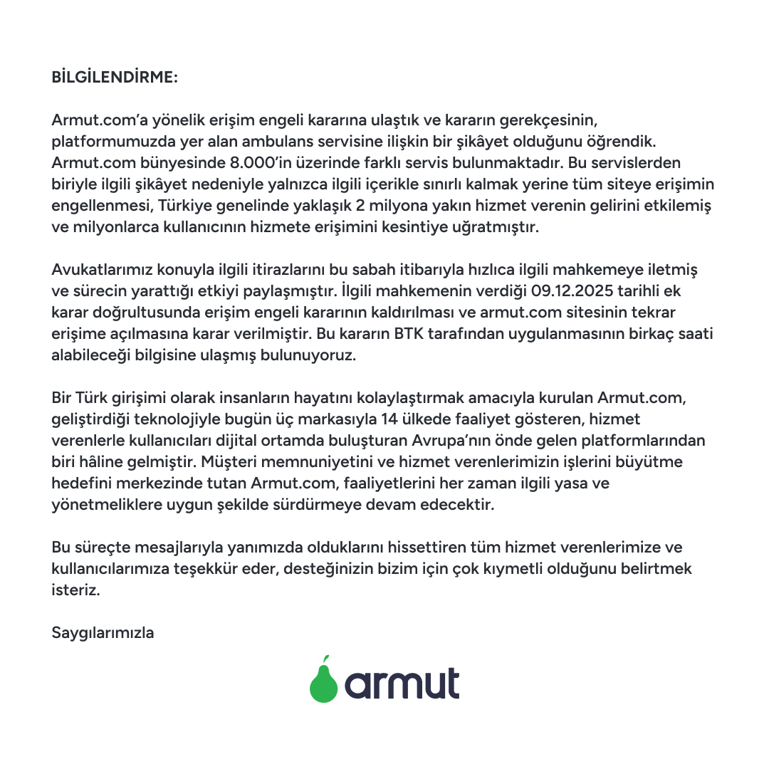 Hizmet almak isteyenlerle hizmet verenleri buluşturan Armut platformu için alınan erişim engeli kararı kaldırıldı. Mahkeme kararıyla kapatılan ve temizlikten nakliyeye, özel dersten tadilata kadar pek çok hizmeti kullanıcılarla buluşturan Armut platformu yeniden erişime açıldı. Şirketten konuya ilişkin yapılan basın açıklamasında şunlar kaydedildi: “Armutcom’a yönelik erişim engeli kararına ulaştık ve kararın gerekçesinin, platformumuzda yer alan ambulans servisine ilişkin bir şikâyet olduğunu öğrendik. Armutcom bünyesinde 8.000’in üzerinde farklı servis bulunmaktadır. Bu servislerden biriyle ilgili şikâyet nedeniyle yalnızca ilgili içerikle sınırlı kalmak yerine tüm siteye erişimin engellenmesi, Türkiye genelinde yaklaşık 2 milyona yakın hizmet verenin gelirini etkilemiş ve milyonlarca kullanıcının hizmete erişimini kesintiye uğratmıştır. Avukatlarımız konuyla ilgili itirazlarını bu sabah itibarıyla hızlıca ilgili mahkemeye iletmiş ve sürecin yarattığı etkiyi paylaşmıştır. İlgili mahkemenin verdiği 09.12.2025 tarihli ek karar doğrultusunda erişim engeli kararının kaldırılması ve armut.com sitesinin tekrar erişime açılmasına karar verilmiştir. Bu kararın BTK tarafından uygulanmasının birkaç saati alabileceği bilgisine ulaşmış bulunuyoruz. Bir Türk girişimi olarak insanların hayatını kolaylaştırmak amacıyla kurulan Armut.com, geliştirdiği teknolojiyle bugün üç markasıyla 14 ülkede faaliyet gösteren, hizmet verenlerle kullanıcıları dijital ortamda buluşturan Avrupa’nın önde gelen platformlarından biri hâline gelmiştir. Müşteri memnuniyetini ve hizmet verenlerimizin işlerini büyütme hedefini merkezinde tutan Armutcom, faaliyetlerini her zaman ilgili yasa ve yönetmeliklere uygun şekilde sürdürmeye devam edecektir. Bu süreçte mesajlarıyla yanımızda olduklarını hissettiren tüm hizmet verenlerimize ve kullanıcılarımıza teşekkür eder, desteğinizin bizim için çok kıymetli olduğunu belirtmek isteriz.”