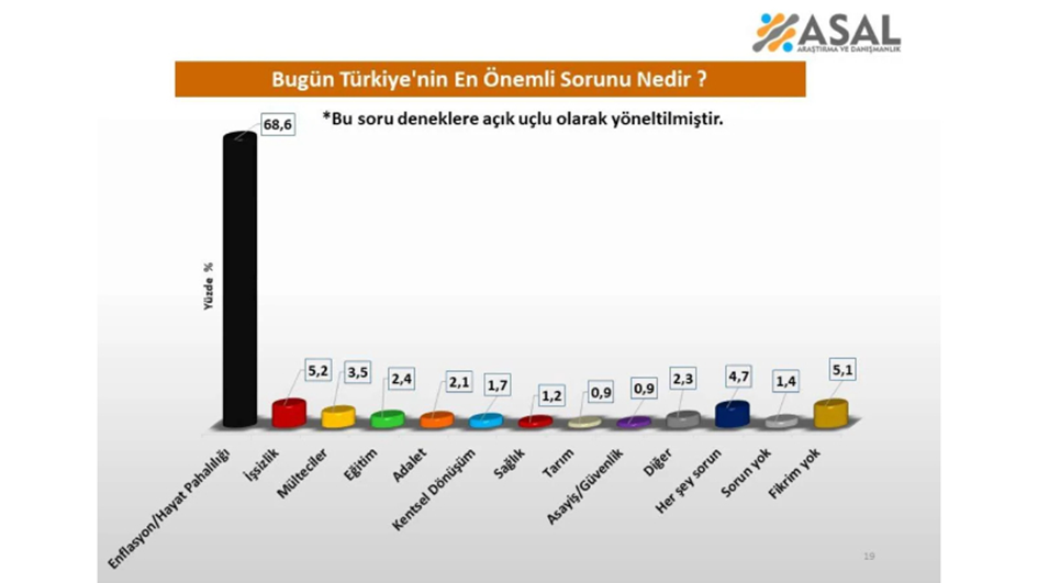 ASAL Araştırma, Türkiye Siyasi Gündem Temmuz 2023 araştırmasının sonuçlarını açıkladı. Yapılan ankette Türkiye’nin en önemli sorununun “hayat pahalılığı” olduğu söylendi. 26 ilde 14-25 Temmuz tarihleri arasında 2 bin 520 kişiyle yapılan ankette, katılımcılara açık uçlu olarak “Bugün Türkiye’nin en önemli sorunu ne?” sorusu yöneltildi. Ankete katılan yurttaşların verdiği yanıtlara göre büyük çoğunluk Türkiye’nin en önemli sorununun “hayat pahalılığı” olduğu bildirildi. Anket sonuçlarına göre ayrıca "işsizlik" yüzde 5,2 ile en büyük sorunlardan biri olurken, “sorun yok” diyenlerin oranı ise yüzde 1,4 olarak kayıtlara geçti. Kaynak: ASAL