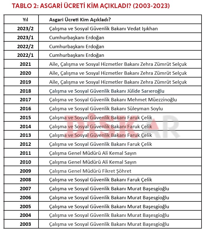 Asgari ücretin belirlenmesiyle ilgili çalışmalarda son düzlüğe girildi. Buna göre 2024 yılında geçerli olacak asgari ücretin bu hafta açıklanması bekleniyor. AK Parti Grup Başkanvekili Muhammet Emin Akbaşoğlu, katıldığı bir televizyon programında gündeme dair açıklamalarda bulundu. Buna göre Akbaşoğlu, yeni asgari ücretin cuma gününe kadar belli olacağını söyledi. Çalışanları enflasyona ezdirmeyeceklerini de belirten Akbaşoğlu, memur ve emeklisini de yüzde 50'ye yakın ücret artışının beklediğini duyurdu. Bu kapsamda Asgari Ücret Tespit Komisyonu da üçüncü toplantısını bu haftanın başlarında yapacak. Eğer tüm tarafların kabul ettiği şekilde bir uzlaşma sağlanırsa, sonucun Cumhurbaşkanı Erdoğan tarafından çarşamba günü yapılması beklenen Kabine toplantısının ardından açıklanması da ihtimaller arasında bulunuyor. 2023 yılının ikinci yarısı için 11 bin 402 lira olarak belirlenen asgari ücret ise Çalışma ve Sosyal Güvenlik Bakanı Prof. Dr. Vedat Işıkhan tarafından duyurulmuştu. DİSK-AR tarafından hazırlanan Asgari Ücret raporunda ise yıllara göre asgari ücreti kimin açıkladığı şöyle listelenmişti: Kaynak: DİSK-AR Asgari ücret nasıl belirleniyor? Asgari ücreti, yasa gereği işçi, işveren ve hükümetten beşer temsilci olmak üzere 15 kişiden oluşan Asgari Ücret Tespit Komisyonu belirliyor. Komisyon, Çalışma ve Sosyal Güvenlik Bakanı tarafından toplantıya çağrılıyor ve yeni asgari ücreti belirleme çalışmaları kapsamında teamül üzerine aralık ayında dört kez toplanıyor. Bakanlığın belirlediği üyelerden birinin başkanlık ettiği komisyon, en az 10 üyenin katılımıyla toplanıp oy çokluğuyla karar veriyor. Oyların eşitliği halinde başkanın bulunduğu tarafın çoğunluğu sağladığı kabul ediliyor. Asgari ücret net 11 bin 402 lira Asgari ücret, bir işçi için aylık brüt 13 bin 414 lira 50 kuruş, vergiler ve kesintiler düştüğünde net 11 bin 402 lira 32 kuruş olarak uygulanıyor. Asgari ücretin işverene toplam maliyeti, bir işçi için 15 bin 762 lira 4 kuruş. Bunun 13 bin 414 lira 50 kuruşu brüt asgari ücret, 2 bin 79 lira 25 kuruşunu sosyal güvenlik primi, 268 lira 29 kuruşunu işveren işsizlik sigorta primi oluşturuyor. [news_id:716914]