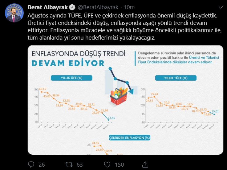 Hazine ve Maliye Bakanı Berat Albayrak, enflasyon rakamlarına ilişkin değerlendirme yaptı. Twitter hesabından açıklama yapan Albayrak, "Ağustos ayında TÜFE, ÜFE ve çekirdek enflasyonda önemli düşüş kaydettik. Üretici fiyat endeksindeki düşüş, enflasyonda aşağı yönlü trendi devam ettiriyor. Enflasyonla mücadele ve sağlıklı büyüme öncelikli politikalarımız ile, tüm alanlarda yıl sonu hedeflerimizi yakalayacağız" dedi. Tüketici fiyatları, ağustos ayında aylık bazda yüzde 0,86 artış gösterirken, baz etkisi nedeniyle yıllık TÜFE yüzde 16,65'ten yüzde 15,01'e geriledi. Çekirdek enflasyon ise yıllık bazda yüzde 16,2'den yüzde 13,6 seviyesine geriledi.