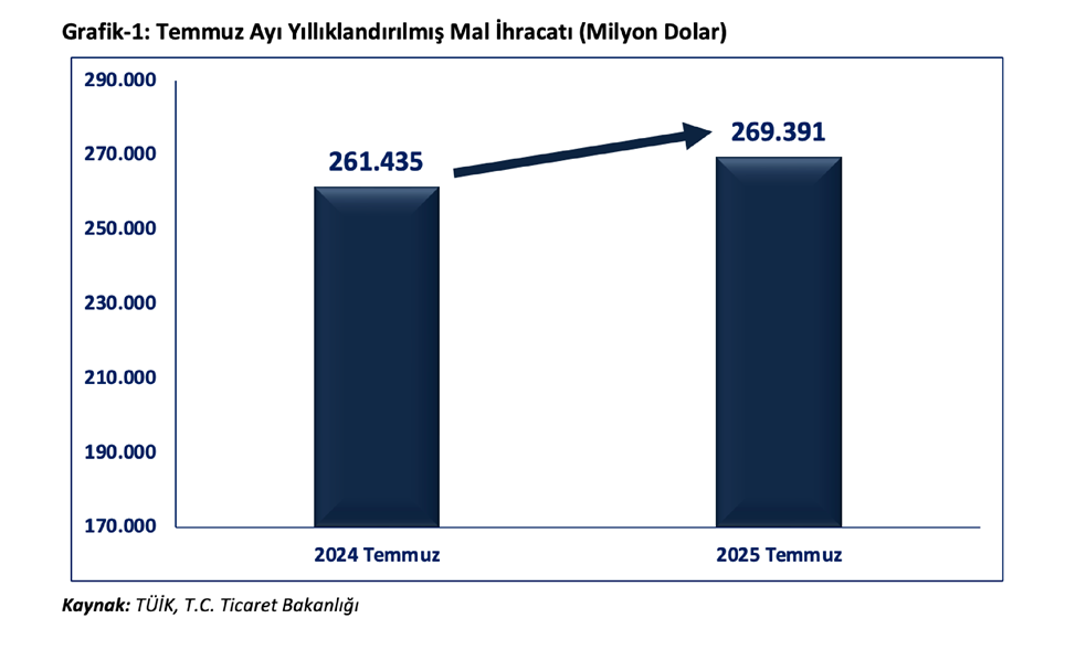 Ticaret Bakanı Ömer Bolat, ihracatın temmuz ayında 24,9 milyar dolarla tüm zamanların rekorunu kırdığını duyurdu. Ticaret Bakanı Ömer Bolat temmuz ayı dış ticaret verilerini açıkladı. Bakan Bolat’ın açıklamalarından öne çıkanlar şunlar oldu: “•Ticaret Bakanlığımız ile Türkiye İstatistik Kurumu iş birliğinde üretilen Temmuz ayı dış ticaret verilerine göre; ihracatımız %11 artarak 24,9 milyar dolar olmuştur. •2025 yılının Ocak-Temmuz döneminde ihracatımız geçen yılın aynı dönemine göre %5,1 artışla 156,3 milyar dolar olmuştur. •2025 Temmuz ayı itibari ile yıllıklandırılmış ihracatımız bir önceki yılın aynı ayına göre 8,0 milyar dolar artarak 269,4 milyar dolara ulaşmıştır. •2025 Temmuz ayında ithalat bir önceki yılın aynı ayına göre %5,4 artarak 31,4 milyar dolar olmuştur. •2025 yılının Ocak-Temmuz döneminde ithalatımız geçen yılın aynı dönemine göre %6,9 artışla 212,2 milyar dolar olmuştur. •2025 Temmuz ayında yıllıklandırılmış ithalatımız bir önceki yılın aynı ayına göre 14,0 milyar dolar artarak 357,7 milyar dolar olarak gerçekleşmiştir. •Dış ticaret açığımız 2025 Temmuz ayında %11,8 oranında azalarak 6,4 milyar dolar olarak gerçekleşmiştir. "Zorluklara rağmen artış devam ediyor" •2025 yılının Ocak-Temmuz döneminde dış ticaret açığımız geçen yılın aynı dönemine göre %12,2 artışla 55,9 milyar dolar olmuştur. •Yıllıklandırılmış dış ticaret açığımız geçen yılın aynı ayına göre 6,0 milyar dolar artarak 88,3 milyar dolar olarak gerçekleşmiştir. •AB-27’nin yıllıklandırılmış ithalatının hala yatay seyrini koruması, zayıf dış talep, yakın coğrafyamızda süregelen savaşlar, iç karışıklıklar ve gerilimler, tarife artışlarının getirdiği belirsizliğin devam etmesiyle beraber gelen zorlu rekabet koşullarına rağmen ihracatımızda artış devam etmektedir. •Ticaret Bakanlığı olarak, ihracatçılarımıza sunduğumuz destekler, ticari diploması faaliyetlerimizin etkisiyle ihracatta elde edilen başarılar, üretim ve istihdam üzerinde olumlu sonuçlar vermektedir.”
