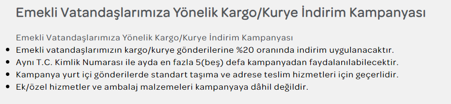 Ulaştırma ve Altyapı Bakanı Abdulkadir Uraloğlu, PTT’nin emeklilere yönelik yüzde 20 indirim kampanyası başlattığını duyurdu. Ulaştırma ve Altyapı Bakanı Abdulkadir Uraloğlu, PTT tarafından emekli vatandaşlara yönelik başlattıkları kargo indirimi kampanyası hakkında açıklamalarda bulundu. Posta, kargo, bankacılık ve e-ticaret alanlarında ülkenin dört bir yanında faaliyetlerini sürdüren PTT ile emekli vatandaşlar için özel bir kampanya başlattıklarını ifade eden Bakan Uraloğlu, “Tüm emekli vatandaşlarımız, kargo gönderimlerinde yüzde 20 indirim fırsatından yararlanabilecekler" ifadelerini kullandı. “Yurt içi varışlı kargo gönderiminde yüzde 20 indirim” Cumhurbaşkanı Recep Tayyip Erdoğan tarafından 2024 yılının “Emekliler Yılı” olarak ilan edildiğini anımsatan Bakan Uraloğlu, “Biz de Ulaştırma ve Altyapı Bakanlığı olarak emeklilerimize yönelik kampanyalarımıza devam ediyoruz. Trenlerde ve şehirlerarası otobüslerde emeklilerimize yönelik indirim kampanyalarına devam ediyoruz. Şimdi de PTT tarafından emekli vatandaşlarımıza yönelik standart taşıma ve adrese teslim hizmetlerde ayda en fazla 5 adet olmak üzere yurt içi varışlı kargo gönderimlerinde yüzde 20 indirim kampanyası başlattık. Kampanyadan yararlanmak isteyen emekli vatandaşlarımız, PTT iş yerlerine gelerek T.C. kimlik numaralarını ibraz etmeleri halinde indirimden faydalanabilecekler." dedi. Bakan Uraloğlu emeklilerin kampanya ile ilgili detaylı bilgilere PTT'nin resmi internet sitesinden veya PTT iş yerlerinden ulaşılabileceğinin de altını çizdi. Kaynak: PTT [news_id:733953]
