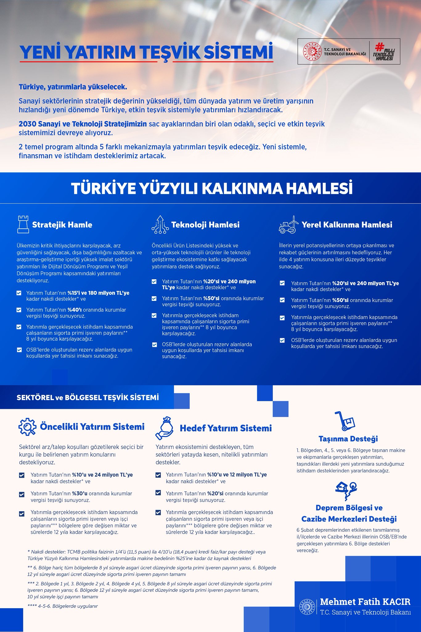 Sanayi ve Teknoloji Bakanı Mehmet Fatih Kacır, yürürlüğe giren yeni Yatırım Teşvik Sistemi’nde faiz/kâr payı desteğiyle yatırım tutarının yüzde 20'sine ve 240 milyon liraya varan teşvikler sunulacağını açıkladı. Sanayi ve Teknoloji Bakanı Mehmet Fatih Kacır, yatırımlarda devlet yardımları hakkında Resmi Gazete'de yayımlanan karara ilişkin sosyal medya hesabından açıklamada bulundu. Kacır’ın konuya ilişkin paylaşımı şöyle oldu: “✔️ Yatırımları hızlandırmak üzere finansman destekleri sağlayacağız. Yatırım kredilerinde 11,5 ila 18,4 puan faiz/kar payı desteği ile yatırım tutarının %20’sine ve 240 milyon TL’ye varan teşvikler sunacağız. Yatırımcının finansman yükü azalacak, yatırım iştahı artacak. ✔️ Yeni Teşvik Sistemi daha seçici ve odaklı olacak. En güçlü destekleri, “Türkiye Yüzyılı Kalkınma Hamlesi” programında sunacağız. Teknolojik Hamle kapsamındaki yüksek katma değerli yatırımlara, Yerel Kalkınma Hamlesi’yle her şehre özgü 4 yatırım konusuna ve Stratejik Hamle ile belirlenen dış ticaret dengesini iyileştirici yatırımlar ile “dijital ve yeşil dönüşüm” yatırımlarına ayrıştırıcı teşvikler vereceğiz. ✔️ Türkiye Yüzyılı Kalkınma Hamlesi kapsamındaki yatırımlar için öz kaynakla yapacakları makine alımlarına, makine bedelinin %25’ine, yatırım tutarının %15’ine ve 240 milyon TL’ye kadar nakdi destek sunacağız. ✔️ Yeni Teşvik Sisteminde, Yatırıma Katkı olarak sunduğumuz Kurumlar Vergisi indirimi, yatırım tutarının %20’si ila %50’si olacak. ✔️ Güncellediğimiz Sosyo-Ekonomik Gelişmişlik Endeksi doğrultusunda istihdam teşviklerini 6 bölgede kademeli olarak uygulayacağız. ✔️ İstihdam teşviklerini daha yüksek limitlerde ve daha uzun sürelerde sunacağız. 6. Bölge illeri, Depremden çok yoğun etkilenen 65 ilçe ve Cazibe Merkezleri programındaki iller en yoğun istihdam teşviklerinden yararlanan yerler olacak. Buralardaki OSB’lerde çalışanların SGK primi işveren paylarını 14 yıl, çalışan paylarını 10 yıl hükümetimiz karşılayacak. ✔️ İl merkezlerinden ciddi düzeyde daha az gelişmiş olan 289 ilçeye bir ileri bölge teşviki sunarak, kalkınma ve refahı tüm ülkeye daha hızlı yayacağız. ✔️ Kapasite fazlası olan sektörlerde verimli olmayacak yatırımları teşvik sisteminden çıkardık. Teşvik sisteminde destekleyeceğimiz yatırımları Hedef Sektörler başlığında adresledik. Programlarda tanımlanmamış sektörler ve ürün gruplarına yönelik yatırımları teşvik etmeyeceğiz. ✔️ Genel Teşvik Sistemini sonlandırdık. Böylelikle teşvik sistemine dahil etmediğimiz sektörlere ve ürünlere yönelik yatırımlarda kullanılan makine ve teçhizatın gümrük vergisi muafiyetini kaldırdık. Yerli makine üreticilerimizi koruduk. ✔️ Türkiye Yüzyılı Kalkınma Hamlesi kapsamındaki yatırımlara OSB’lerde oluşturulan rezerv alanlarda, uygun koşullarda yer tahsis edilecek. ✔️ 1. Bölgedeki (En yüksek sosyo-ekonomik gelişmişlik düzeyindeki illerdeki) makine ve teçhizatın, 4., 5. ve 6. Bölgeye taşınması ile gerçekleşen yatırımlar için taşındıkları bölgedeki istihdam teşviklerini uygulayacağız. Böylelikle sanayi tesislerinin özellikle Marmara Bölgesinden, Anadolu şehirlerine taşınmasını sağlayacağız. ✔️ OSB’lerde ve Endüstri Bölgelerinde gerçekleşen yatırımlara bir üst bölge illerinde uyguladığımız -daha ileri- teşvikleri sunarak planlı sanayileşmeyi destekleyeceğiz. ✔️ Yeni Yatırım Teşvik Sistemi 31/12/2030 tarihine kadar sürecek.” Kaynak: Mehmet Fatih Kacır - X