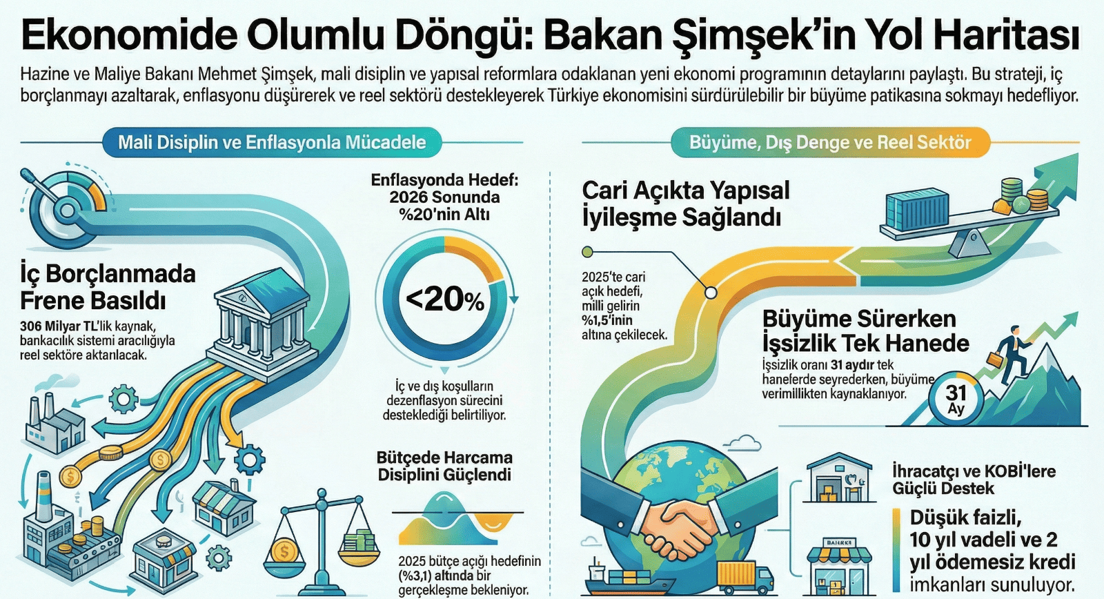 Hazine ve Maliye Bakanı Mehmet Şimşek, iç borçlanmada frene basılacağını ve yılın ilk çeyreğinde ödedikleri borçtan daha az borçlanacaklarını açıkladı. Yüzde 80 iç borç çevirme oranı sayesinde yaklaşık 306 milyar TL’lik kaynağın bankacılık sistemi içinde kalarak reel sektörün kullanımına bırakılacağını belirtti. Enflasyon, cari denge, bütçe disiplini ve büyümeye ilişkin değerlendirmelerde bulunan Şimşek, ekonomi politikalarında olumlu bir döngüye girildiğini ifade etti. Hazine ve Maliye Bakanı Mehmet Şimşek, yılın ilk çeyreğinde ödedikleri borçtan daha az borçlanacaklarını belirterek, iç borç çevirme oranının yüzde 80 seviyesinde tutulacağını söyledi. Bu yaklaşım sayesinde ilk 3 ayda yaklaşık 306 milyar TL’lik kaynağın bankacılık sistemi içinde kalacağını ifade eden Şimşek, söz konusu kaynağın reel sektörün kullanımına bırakılacağını dile getirdi. Şimşek, “Yavaş yavaş öyle bir döneme gireceğiz ki, bankalar sizin kapınızı çalmaya başlayacak.” dedi. Şimşek, MÜSİAD’ın “2025 Yılı Değerlendirmesi 2026 Yılı Beklentileri” programındaki konuşmasında, zayıf dolar ve düşük petrol fiyatlarının dezenflasyonu desteklediğini, risk iştahının ise nispeten yüksek seyrettiğini söyledi. Hem iç hem de dış koşulların enflasyonda ilave düşüşü desteklediğini belirten Şimşek, “Mesele şu: Biz 2026'nın sonunda yüzde 20'nin altına düşebilecek miyiz? Geçen sene yaşadığımız birtakım şokları yaşamazsak ben olabileceğine samimi şekilde inanıyorum.” ifadelerini kullandı. Şimşek, bu hedef doğrultusunda uygun bir politika setiyle ilerlediklerini de vurguladı. Cari denge, bütçe disiplini ve büyüme görünümü Dezenflasyon sürecinin başlamasıyla gelir dağılımında sınırlı bir iyileşme yaşandığını kaydeden Şimşek, cari açığın düştüğünü ve düşük kalmaya devam ettiğini söyledi. Altın ithalatı hariç tutulduğunda Türkiye’de cari dengede yapısal bir iyileşme olduğunu belirten Şimşek, 2024’te altın hariç cari fazla verildiğini, 2025’te ise altın hariç açığın yalnızca yüzde 0,3 seviyesinde gerçekleştiğini ifade etti. 2026’da da benzer bir görünüm öngördüklerini aktaran Şimşek, Türkiye’nin brüt dış finansman ihtiyacının milli gelire oranının 2025’te yüzde 17’nin altına çekildiğini, 2026’da ise yüzde 15’in altına düşeceğini söyledi. Cari açık hedeflerine de değinen Şimşek, 2025 için milli gelire oranla yüzde 2 olarak belirlenen hedefin, yıl sonunda yüzde 1,5’in altında gerçekleşmesini beklediklerini ifade etti. Bankacılık sektörü ile reel sektörün dış finansmana erişiminde önemli ölçüde iyileşme sağlandığını belirten Şimşek, maliyetlerde de belirgin bir rahatlama olduğunu söyledi. Bütçe tarafında elde edilen kazanımlara dikkat çeken Şimşek, deprem nedeniyle 2023-2024 döneminde yüksek bütçe açıkları verildiğini hatırlattı. 2025 için açığın yüzde 3,1’e düşmesinin öngörüldüğünü ancak gerçekleşmelerin bu oranın da altında kalacağını gösterdiğini belirtti. Harcama disiplininin güçlendiğini söyleyen Şimşek, 2024’te 100 liralık bütçenin yalnızca 96,7 lirasının harcandığını, 2025’te de benzer bir yaklaşımın sürdüğünü aktardı. Büyüme cephesinde ise ilk üç çeyrekte yüzde 3,7’lik bir büyüme gerçekleştiğini hatırlatan Şimşek, yıl geneli için hedefin yüzde 3,8 civarında olduğunu söyledi. İşsizlik oranının 31 aydır tek hanede seyrettiğini belirten Şimşek, büyümenin önemli bir kısmının toplam faktör verimliliğinden kaynaklandığını ifade etti. Reel sektör, ihracat ve yapısal politikalar Reel sektörün bazı zorluklarla karşı karşıya olduğunu kabul eden Şimşek, bu sorunların yalnızca uygulanan programla ilişkilendirilmesinin doğru olmayacağını söyledi. Konkordato başvurularına ilişkin değerlendirmelerde bulunan Şimşek, başvuruların yaklaşık yüzde 60’ının kabul edildiğini, bu firmaların toplam ekonomi ve kredi hacmi içindeki payının sınırlı olduğunu dile getirdi. İhracatın temel belirleyicisinin dış talep olduğunu vurgulayan Şimşek, dış talepteki bir birimlik değişimin ihracatı 2,3 birim etkilediğini, reel kurdaki bir birimlik değişimin ise ihracata etkisinin yüzde 0,2 seviyesinde kaldığını söyledi. Yenilenebilir enerji yatırımları ve yerli petrol-doğal gaz üretimindeki artışın, enerjide dışa bağımlılığı azalttığını da sözlerine ekledi. Programın yalnızca para politikasına dayanmadığını belirten Şimşek, arz yönlü politikalar, rekabet gücünü artıracak yapısal adımlar ve üretim kapasitesini güçlendirecek reformların eş zamanlı olarak devrede olduğunu söyledi. Merkez Bankasının faiz indirimlerinin ticari kredi faizlerine yansımaya başladığını ifade eden Şimşek, “Tekrar olumlu bir döngüye girdik.” dedi. Şimşek, ihracatçılar, KOBİ’ler ve yatırımcılara yönelik desteklerin süreceğini, YTAK kapsamında belirlenen 284 ürün için 10 yıl vadeli, 2 yıl ödemesiz ve piyasa faizinin üçte birine kadar düşük faizli kredi imkanının sunulduğunu belirtti. 2026’da da Eximbank ve reeskont kredileri üzerinden güçlü desteklerin devam edeceğini söyleyen Şimşek, iş dünyasına daha nitelikli ve yüksek katma değerli üretime odaklanma çağrısı yaptı.