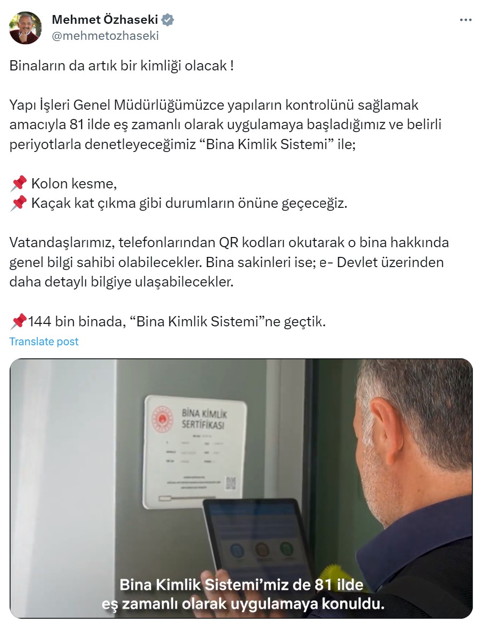 Bakan Özhaseki, 144 bin binada "Bina Kimlik Sistemi'ne geçildiğini belirterek, bu sistemle kolon kesme ve kaçak kat çıkma gibi eylemlerin de önüne geçileceğini söyledi. Çevre, Şehircilik ve İklim Değişikliği Bakanı Mehmet Özhaseki, sosyal medya hesabından Yapı İşleri Genel Müdürlüğünce 2021'de hayata geçirilen Bina Kimlik Sistemi uygulamasına ilişkin paylaşımda bulundu. Özhaseki, 144 bin binada "Bina Kimlik Sistemi"ne geçildiğini belirterek, "Yapı İşleri Genel Müdürlüğümüzce yapıların kontrolünü sağlamak amacıyla 81 ilde eş zamanlı olarak uygulamaya başladığımız ve belirli periyotlarla denetleyeceğimiz, 'Bina Kimlik Sistemi' ile kolon kesme, kaçak kat çıkma gibi durumların önüne geçeceğiz" ifadelerini kullandı. Vatandaşların telefonlarından QR kodları okutarak o bina hakkında genel bilgi sahibi olabileceğini, bina sakinlerinin ise e-Devlet üzerinden daha detaylı bilgiye ulaşabileceğini belirten Özhaseki, sisteme ilişkin videoya da paylaşımında yer verdi. Kaynak: Mehmet Özhaseki - X 2021 öncesi yapıların da sisteme dahil edilmesi hedefleniyor Videoda, uygulama ile ilgili değerlendirmelerine yer verilen Çevre, Şehircilik ve İklim Değişikliği Bakanlığı Yapı Denetim Daire Başkanı Doğan Yorulmaz ise denetim faaliyeti sona eren binalarda, ekiplerin dijital kimlik belgesini oluşturup binaya monte ettiğini anlattı. Yorulmaz, 2021'den önceki yapıların da benzer şekilde kimlik bilgilerinin oluşturulup denetime katılmasının hedeflendiğini kaydetti. [news_id:718201]
