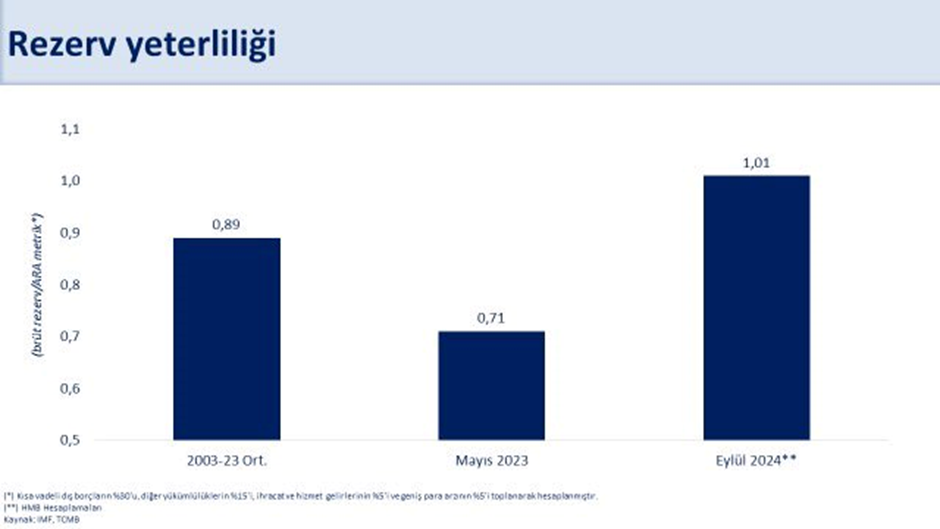 Bakan Şimşek, brüt rezervlerin 156,4 milyar dolarla tarihi yüksek seviyeye ulaştığını bildirerek, "Rezerv yeterliliğimiz uluslararası tanıma göre eşik seviyeyi aştı." ifadesini kullandı. Hazine ve Maliye Bakanı Mehmet Şimşek, sosyal medya hesabından Merkez Bankası rezervlerine ilişkin paylaşım yaptı. Rezervlerdeki yükselişe dikkati çeken Şimşek, "Brüt rezervlerimiz 156,4 milyar dolarla tarihi yüksek seviyeye ulaştı. Swap hariç net rezervler ise geçen yılın mayıs ayına göre 90,5 milyar dolar artışla 5,5 yılın zirvesi olan 29,9 milyar dolara yükseldi. Rezerv yeterliliğimiz uluslararası tanıma göre eşik seviyeyi aştı." değerlendirmesinde bulundu. Kaynak: Mehmet Şimşek - X Şimşek, ekonomi programı sayesinde azalan cari açık ve artan rezervlerin, ülkenin risk primini düşürürken finansal istikrarı güçlendirdiğini de kaydetti. [news_id:747177]
