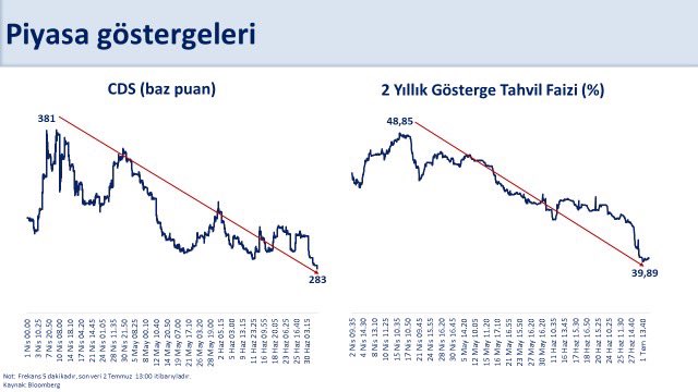 Küresel koşulların zorluklarına rağmen ihracatın dirençli yapısını koruduğunu bildiren Hazine ve Maliye Bakanı Mehmet Şimşek, "Dezenflasyon süreciyle yurt içi finansal koşulların önümüzdeki dönemde daha da iyileşmesini bekliyoruz." açıklamasında bulundu. Hazine ve Maliye Bakanı Mehmet Şimşek, sosyal medya hesabı üzerinden makroekonomik verilerdeki son gelişmeleri değerlendirdi. Küresel koşulların zorluklarına rağmen ihracatın dirençli yapısını koruduğuna işaret eden Şimşek, "Cari açık, öngörülerimiz doğrultusunda gerçekleşirken sürdürülebilir seviyelerde kalmaya devam ediyor." ifadesini kullandı. Nisanda 381 baz puana kadar yükselen risk priminin (CDS) haziran sonu itibarıyla 283 baz puana gerilediğinin altını çizen Şimşek, şunları aktardı: "İki yıllık gösterge tahvil faizi ise yüzde 49'dan yüzde 40'ın altına indi. CDS ve borçlanma maliyetlerindeki düşüş, kararlı ve sabırlı duruşumuzun olumlu sonuçlarını net bir şekilde ortaya koyuyor. Dezenflasyon süreciyle yurt içi finansal koşulların önümüzdeki dönemde daha da iyileşmesini bekliyoruz." Kaynak: Mehmet Şimşek