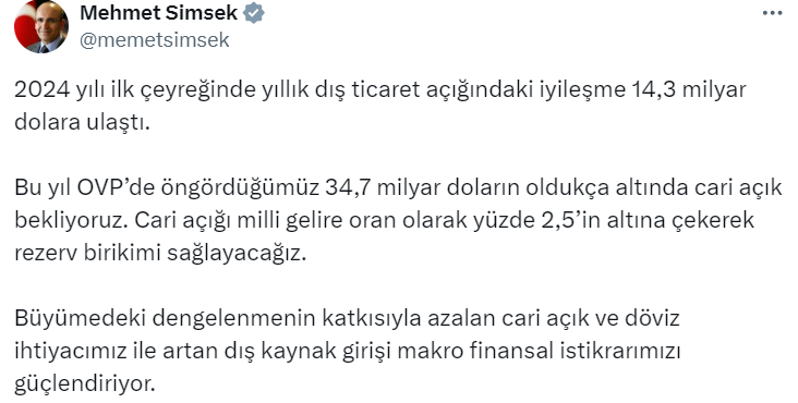 Hazine ve Maliye Bakanı Mehmet Şimşek, cari açığı milli gelire oran olarak yüzde 2,5’in altına çekerek, rezerv birikimi sağlayacaklarını söyledi. Hazine ve Maliye Bakanı Mehmet Şimşek, dış ticaret verilerine ilişkin sosyal medya hesabından yaptığı kısa değerlendirmede, rezervlerde birikim sağlanacağı mesajını verdi. X hesabından mart ayı ihracat verilerini değerlendiren Şimşek, 2024 yılı ilk çeyreğinde dış ticaret açığındaki iyileşmenin 14,3 milyar dolara ulaştığını da aktardı. Bu yıl OVP'de öngördükleri 34,7 milyar doların oldukça altında cari açık beklediklerini kaydeden Şimşek, "Cari açığı milli gelire oran olarak yüzde 2,5’in altına çekerek rezerv birikimi sağlayacağız. Büyümedeki dengelenmenin katkısıyla azalan cari açık ve döviz ihtiyacımız ile artan dış kaynak girişi makro finansal istikrarımızı güçlendiriyor." dedi. Kaynak: Mehmet Şimşek - X [news_id:729463]