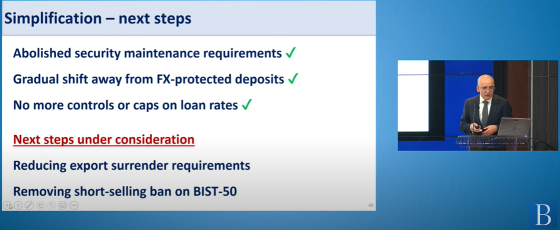 Hazine ve Maliye Bakanı Mehmet Şimşek, ABD'de Brookings Enstitüsü’nde yaptığı açıklamada, BIST 50 endeksinde açığa satış yasağının kaldırılmasının değerlendirildiğini bildirdi. Hazine ve Maliye Bakanı Mehmet Şimşek, ABD'de Brookings Enstitüsü’nde bir sunum gerçekleştirdi. Bakan Şimşek, ilgili sunumun "Makro i̇hti̇yati̇ tedbi̇rleri̇n gevşemesi̇nde sırada ne var?" kısmında, değerlendirilmekte olan sonraki adımlar arasında BIST 50 endeksinde açığa satış yasağının kaldırılmasına yer verdi. Kaynak: Brookings Enstitüsü - Youtube İlgili sunumda Şimşek, kredi faizleri üzerinde sınırlama olmadığını ve döviz korumalı mevduatlardan da kademeli olarak uzaklaşıldığını aktardı. [news_id:750538]
