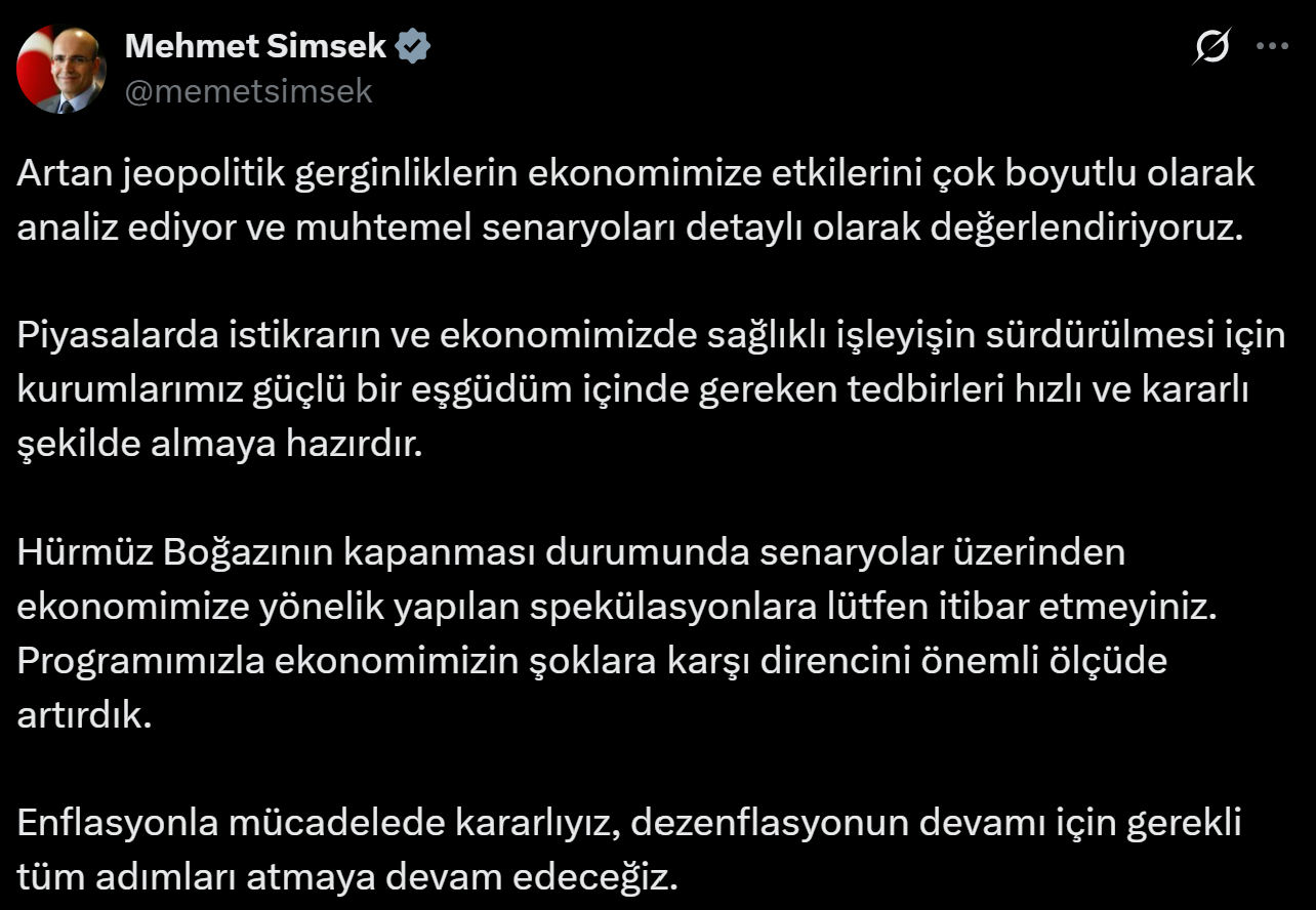 Artan jeopolitik gerginliklerin etkilerini çok boyutlu olarak analiz ettiklerini belirten Hazine ve Maliye Bakanı Mehmet Şimşek, "Piyasalarda istikrarın ve ekonomimizde sağlıklı işleyişin sürdürülmesi için kurumlarımız güçlü bir eşgüdüm içinde gereken tedbirleri hızlı ve kararlı şekilde almaya hazırdır" dedi. Hazine ve Maliye Bakanı Mehmet Şimşek, bölgede yaşanan jeopolitik gelişmelerle ilgili açıklama yaptı. Şimşek, sosyal medya hesabından yaptığı açıklamada şunları kaydetti: “Artan jeopolitik gerginliklerin ekonomimize etkilerini çok boyutlu olarak analiz ediyor ve muhtemel senaryoları detaylı olarak değerlendiriyoruz. Piyasalarda istikrarın ve ekonomimizde sağlıklı işleyişin sürdürülmesi için kurumlarımız güçlü bir eşgüdüm içinde gereken tedbirleri hızlı ve kararlı şekilde almaya hazırdır. Hürmüz Boğazının kapanması durumunda senaryolar üzerinden ekonomimize yönelik yapılan spekülasyonlara lütfen itibar etmeyiniz. Programımızla ekonomimizin şoklara karşı direncini önemli ölçüde artırdık. Enflasyonla mücadelede kararlıyız, dezenflasyonun devamı için gerekli tüm adımları atmaya devam edeceğiz.” Kaynak: Mehmet Şimşek - X [news_id:776168]