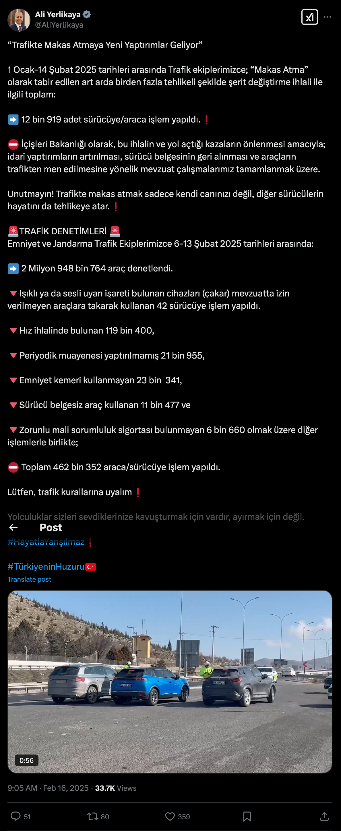 İçişleri Bakanı Ali Yerlikaya, makas atanlara yönelik idari yaptırımların artırılması, sürücü belgesinin geri alınması ve araçların trafikten men edilmesine yönelik çalışmalarda sona gelindiğini söyledi. İçişleri Bakanı Ali Yerlikaya, trafik denetimlerine ilişkin sosyal medya hesabından paylaşımda bulundu. Bakan Yerlikaya, 1 Ocak-14 Şubat 2025 tarihleri arasında trafik ekiplerinin “makas atma” olarak tabir edilen art arda birden fazla tehlikeli şekilde şerit değiştirme ihlali ile ilgili toplam 12 bin 919 adet sürücüye/araca işlem yapıldığını duyurdu. Yerlikaya trafikte makas atanlara yönelik yeni yaptırımlar geleceğini vurgulayarak şunları aktardı: "İçişleri Bakanlığı olarak, bu ihlalin ve yol açtığı kazaların önlenmesi amacıyla; idari yaptırımların artırılması, sürücü belgesinin geri alınması ve araçların trafikten men edilmesine yönelik mevzuat çalışmalarımız tamamlanmak üzere. Unutmayın. Trafikte makas atmak sadece kendi canınızı değil, diğer sürücülerin hayatını da tehlikeye atar." Bir haftada yaklaşık 3 milyon araç denetlendi Bakan Yerlikaya 6-13 Şubat tarihleri arasındaki verilere ilişkin de şu bilgileri paylaştı: "2 milyon 948 bin 764 araç denetlendi. Işıklı ya da sesli uyarı işareti bulunan cihazları (çakar) mevzuatta izin verilmeyen araçlara takarak kullanan 42 sürücüye işlem yapıldı. Hız ihlalinde bulunan 119 bin 400, periyodik muayenesi yaptırılmamış 21 bin 955, emniyet kemeri kullanmayan 23 bin 341, sürücü belgesiz araç kullanan 11 bin 477 ve zorunlu mali sorumluluk sigortası bulunmayan 6 bin 660 olmak üzere diğer işlemlerle birlikte toplam 462 bin 352 araca/sürücüye işlem yapıldı." [news_id:762074]