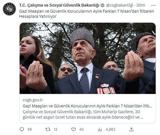 Çalışma ve Sosyal Güvenlik Bakanlığı'ndan yapılan açıklamaya göre, Gazi ve güvenlik korucuları emekli aylıklarında 1 Nisan tarihinden itibaren oluşan aylık farkları yarından itibaren hesaplara yatırılacak. En düşük emekli maaşının 7 bin 500 liraya çıkarılmasını içeren kanun, Resmi Gazete'de yayımlanarak yürürlüğe girdi. Bu kapsamda, güvenlik korucuları ve vefatları halinde hak sahiplerine bağlanan emekli aylıklarında da, en düşük aylık 7 bin 500 lira oldu. Muharip gazi aylıkları ile vefatları halinde yakınlarına bağlanan aylıkların ise 1 Nisan tarihinden geçerli olarak 30 günlük net asgari ücret seviyesine yükseltilmesi sağlandı. Bu gelişmelerin ardından Çalışma ve Sosyal Güvenlik Bakanlığı'ndan yapılan açıklamada ise düzenlemeler kapsamındaki vatandaşların 1 Nisan tarihinden geçerli olarak oluşan aylık farklarının yarın itibarıyla hesaplara yatırılacağı bildirildi. Kaynak: Çalışma ve Sosyal Güvenlik Bakanlığı - Twitter