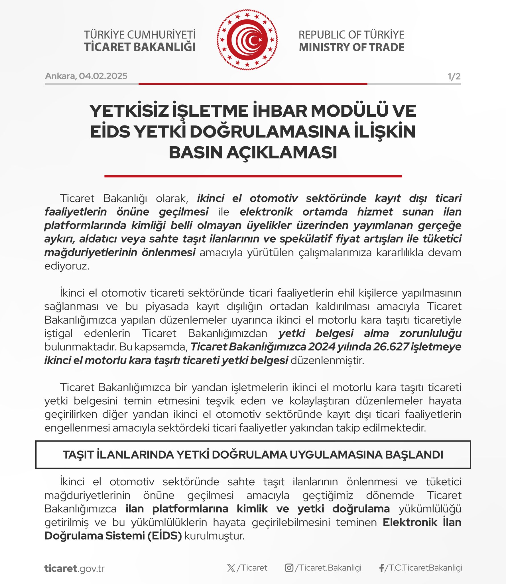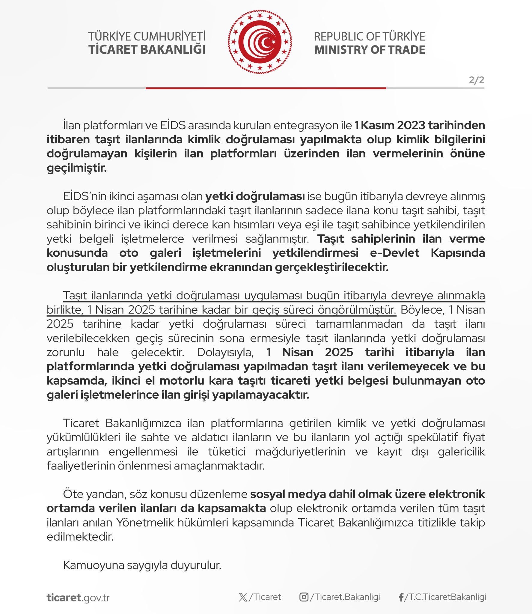 Ticaret Bakanlığı, Elektronik İlan Doğrulama Sistemi (EİDS) üzerinden taşıt ilanlarında yetki doğrulaması uygulamasını bugün itibarıyla devreye aldı. 1 Nisan’a kadar sürecek geçiş döneminin ardından yetki belgesi bulunmayan oto galeri işletmeleri elektronik platformlarda ilan veremeyecek. Bakanlık, ikinci el otomotiv sektöründe kayıt dışı ticari faaliyetleri önlemek ve gerçeğe aykırı, aldatıcı veya sahte ilanların yol açtığı spekülatif fiyat artışlarını engellemek amacıyla uygulamaya konulan düzenlemelere kararlılıkla devam edildiğini bildirdi. Açıklamada, "Bakanlığımızca 2024 yılında 26 bin 627 işletmeye ikinci el motorlu kara taşıtı ticareti yetki belgesi düzenlenmiştir." ifadesine yer verilirken, sektördeki kayıt dışı ticaretin engellenmesi için ticari faaliyetlerin yakından takip edildiği vurgulandı. 1 Nisan’dan sonra zorunlu hale gelecek 1 Kasım 2023’ten itibaren kimlik doğrulaması zorunluluğu getirilirken, bugünden itibaren yetki doğrulaması aşamasına geçildi. Böylece, ilan platformlarında sadece araç sahibi, birinci ve ikinci derece kan hısımları veya eşi ile taşıt sahibinin yetkilendirdiği belgeli işletmelerin ilan verebilmesi sağlandı. Bakanlık, taşıt sahiplerinin oto galeri işletmelerini yetkilendirme işlemini e-Devlet üzerinden gerçekleştirebileceğini belirtti. 1 Nisan’a kadar sürecek geçiş sürecinde yetki doğrulaması tamamlanmadan da ilan verilebilecek, ancak bu tarihten sonra yetki belgesi olmadan taşıt ilanı girişi yapılamayacak. Sosyal medya dahil tüm platformlar denetlenecek Bakanlık, ilan platformlarına getirilen kimlik ve yetki doğrulaması yükümlülüklerinin, sahte ve aldatıcı ilanları engellemeyi, spekülatif fiyat artışlarını önlemeyi ve kayıt dışı galericilik faaliyetlerine son vermeyi amaçladığını belirtti. Ayrıca, söz konusu düzenlemenin yalnızca ilan platformlarıyla sınırlı olmadığı, sosyal medya dahil olmak üzere tüm elektronik ortamda verilen ilanların yönetmelik hükümlerine uygun şekilde takip edileceği vurgulandı. Kaynak: Ticaret Bakanlığı