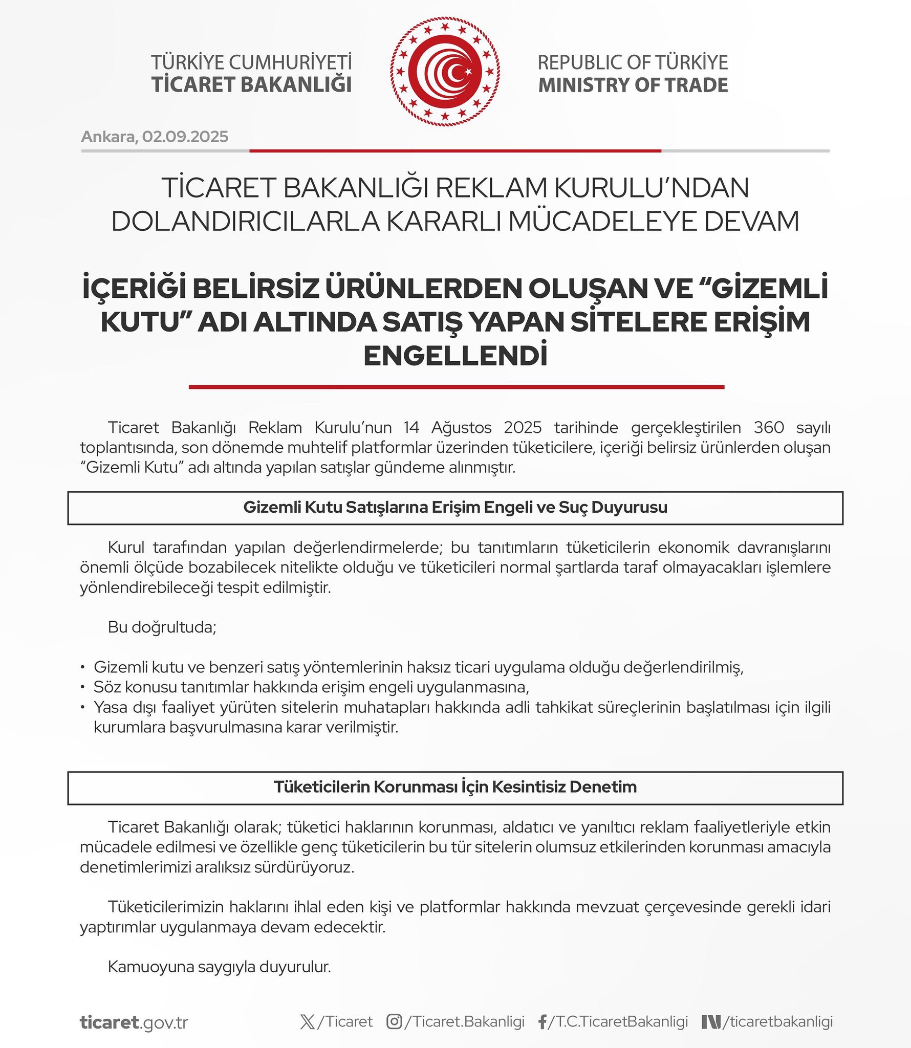 Ticaret Bakanlığı Reklam Kurulu, internet üzerinden satılan ve içeriği belirsiz ürünlerden oluşan “gizemli kutu” satışı yapan sitelere erişim engeli getirdi. Ticaret Bakanlığı Reklam Kurulu, internet üzerinden satılan ve içeriği belirsiz ürünlerden oluşan “gizemli kutu” uygulamalarına erişim engeli getirdi. Bakanlıktan yapılan açıklamaya göre, 14 Ağustos 2025’te gerçekleştirilen 360. toplantıda, son dönemde çeşitli platformlarda yaygınlaşan gizemli kutu satışları ele alındı. Kurulun değerlendirmelerinde, bu tür tanıtımların tüketicilerin ekonomik kararlarını olumsuz yönde etkilediği ve kişileri normal şartlarda tercih etmeyecekleri işlemlere yönlendirdiği tespit edildi. Bu çerçevede konuya ilişkin yapılan açıklamada şu ifadelere yer verildi: "Gizemli kutu ve benzeri satış yöntemlerinin haksız ticari uygulama olduğu değerlendirilmiş, söz konusu tanıtımlar hakkında erişim engeli uygulanmasına, yasa dışı faaliyet yürüten sitelerin muhatapları hakkında adli tahkikat süreçlerinin başlatılması için ilgili kurumlara başvurulmasına karar verilmiştir. Ticaret Bakanlığı olarak; tüketici haklarının korunması, aldatıcı ve yanıltıcı reklam faaliyetleriyle etkin mücadele edilmesi ve özellikle genç tüketicilerin bu tür sitelerin olumsuz etkilerinden korunması amacıyla denetimlerimizi aralıksız sürdürüyoruz. Tüketicilerimizin haklarını ihlal eden kişi ve platformlar hakkında mevzuat çerçevesinde gerekli idari yaptırımlar uygulanmaya devam edecektir." Kaynak: Ticaret Bakanlığı [news_id:783171]