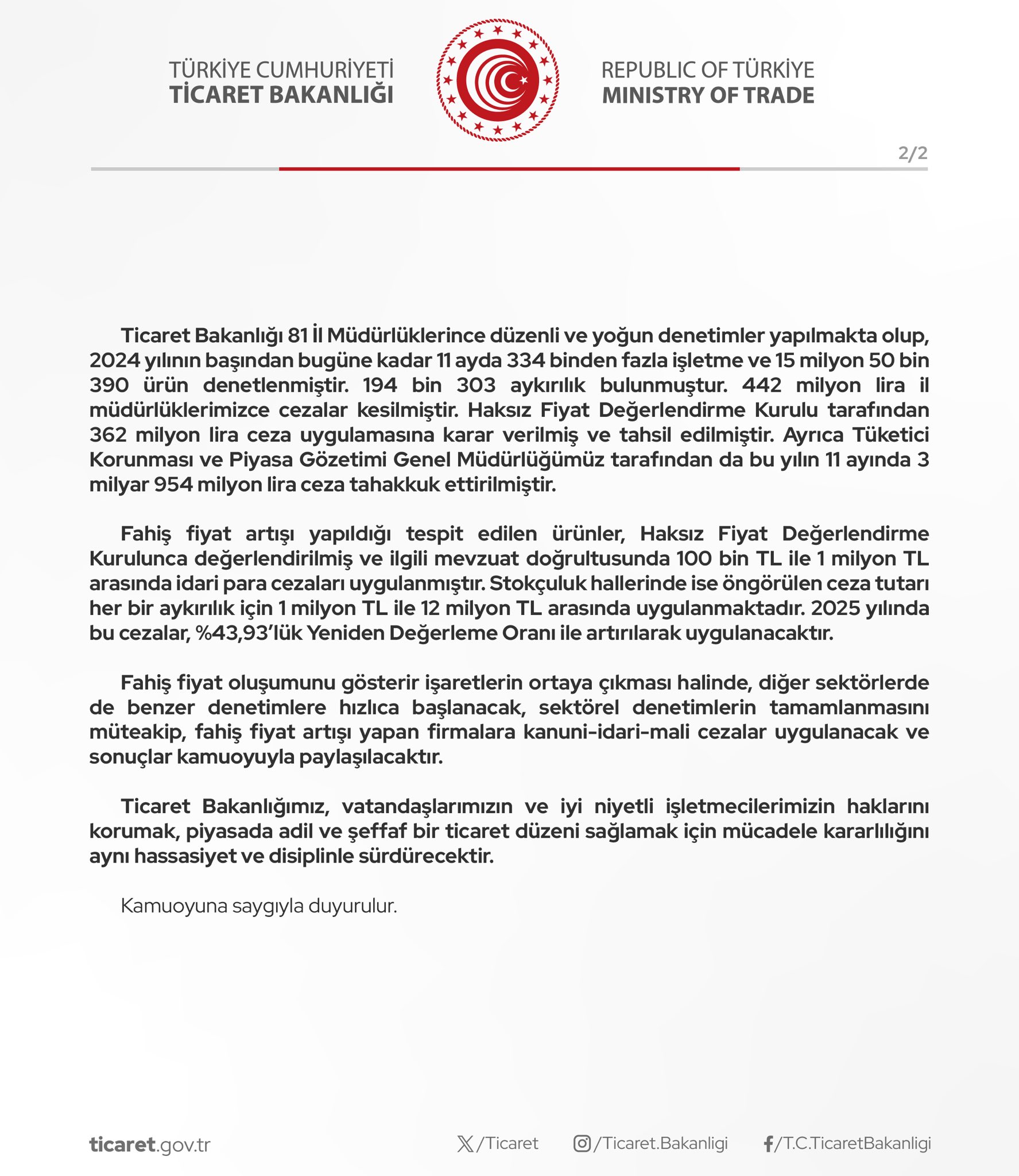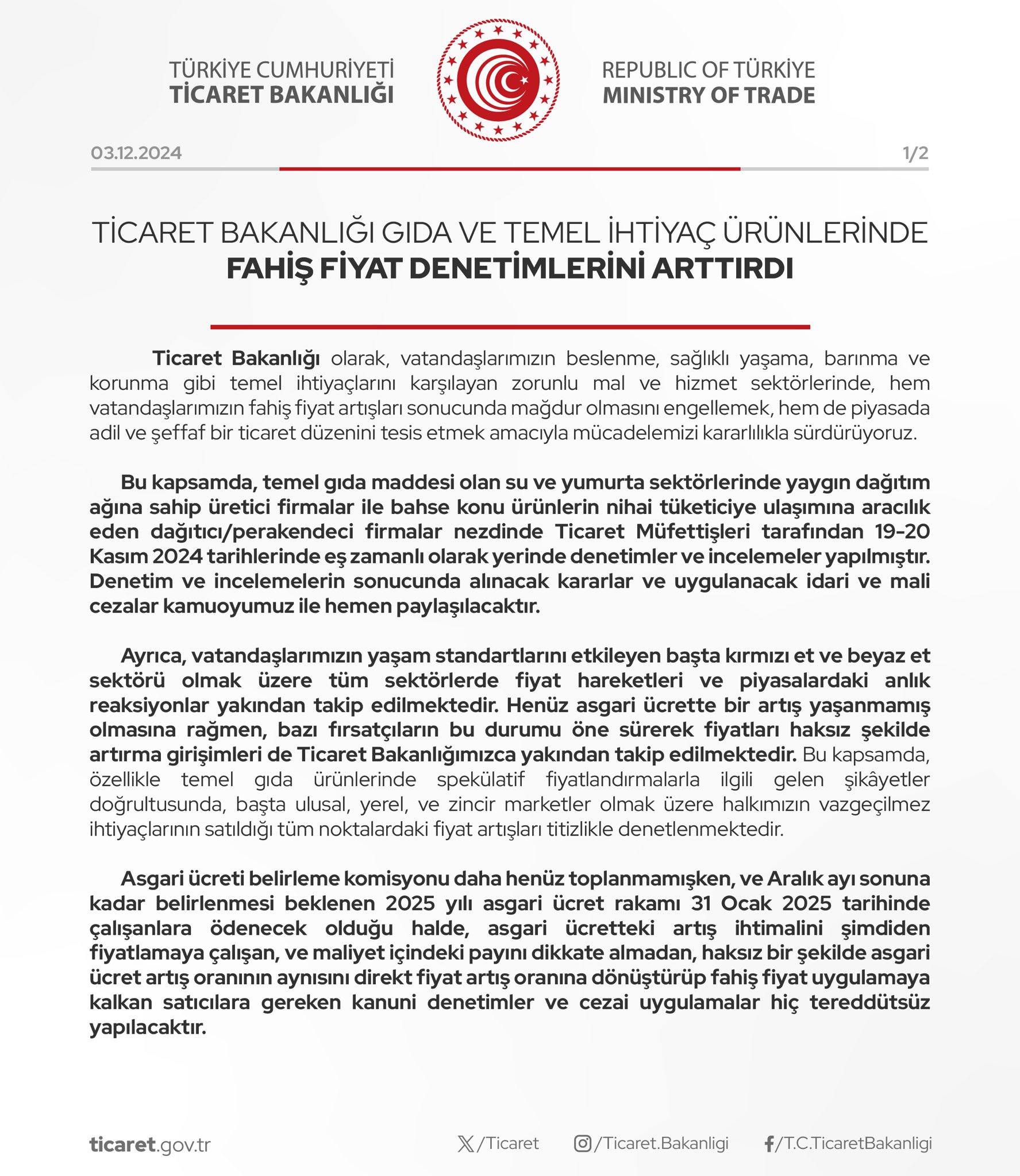 Ticaret Bakanlığı, henüz asgari ücrette bir artış yaşanmamış olmasına rağmen, bazı fırsatçıların bu durumu öne sürerek fiyatları haksız şekilde artırma girişimleri olduğunu, gıda ve temel ihtiyaç ürünlerinde fahiş fiyat denetimlerini artırdıklarını bildirdi. Ticaret Bakanlığı tarafından yayımlanan yazılı açıklamada, asgari ücret artışı gerçekleşmeden ürün fiyatlarında artışa giden işletmeler uyarıldı. Bakanlığın ilgili açıklamasında şunlar kaydedildi: "Bu kapsamda, temel gıda maddesi olan su ve yumurta sektörlerinde yaygın dağıtım ağına sahip üretici firmalar ile bahse konu ürünlerin nihai tüketiciye ulaşımına aracılık eden dağıtıcı/perakendeci firmalar nezdinde Ticaret Müfettişleri tarafından 19-20 Kasım 2024 tarihlerinde eş zamanlı olarak yerinde denetimler ve incelemeler yapılmıştır. Denetim ve incelemelerin sonucunda alınacak kararlar ve uygulanacak idari ve mali cezalar kamuoyumuz ile hemen paylaşılacaktır. Ayrıca, vatandaşlarımızın yaşam standartlarını etkileyen başta kırmızı et ve beyaz et sektörü olmak üzere tüm sektörlerde fiyat hareketleri ve piyasalardaki anlık reaksiyonlar yakından takip edilmektedir. Henüz asgari ücrette bir artış yaşanmamış olmasına rağmen, bazı fırsatçıların bu durumu öne sürerek fiyatları haksız şekilde artırma girişimleri de Ticaret Bakanlığımızca yakından takip edilmektedir. Bu kapsamda, özellikle temel gıda ürünlerinde spekülatif fiyatlandırmaları ilgili gelen şikâyetler doğrultusunda, başta ulusal, yerel, ve zincir marketler olmak üzere halkımızın vazgeçilmez ihtiyaçlarının satıldığı tüm noktalardaki fiyat artışları titizlikle denetlenmektedir. Asgari ücreti belirleme komisyonu daha henüz toplanmamışken, ve Aralık ayı sonuna kadar belirlenmesi beklenen 2025 yılı asgari ücret rakamı 31 Ocak 2025 tarihinde çalışanlara ödenecek olduğu halde, asgari ücretteki artış ihtimalini şimdiden fiyatlamaya çalışan, ve maliyet içindeki payını dikkate almadan, haksız bir şekilde asgari ücret artış oranının aynısını direkt fiyat artış oranına dönüştürüp fahiş fiyat uygulamaya kalkan satıcılara gereken kanuni denetimler ve cezai uygulamalar hiç tereddütsüz yapılacaktır. Kaynak: Ticaret Bakanlığı Ticaret Bakanlığı 81 İl Müdürlüklerince düzenli ve yoğun denetimler yapılmakta olup, 2024 yılının başından bugüne kadar 11 ayda 334 binden fazla işletme ve 15 milyon 50 bin 390 ürün denetlenmiştir. 194 bin 303 aykırılık bulunmuştur. 442 milyon lira il müdürlüklerimizce cezalar kesilmiştir. Haksız Fiyat Değerlendirme Kurulu tarafından 362 milyon lira ceza uygulamasına karar verilmiş ve tahsil edilmiştir. Ayrıca Tüketici Korunması ve Piyasa Gözetimi Genel Müdürlüğümüz tarafından da bu yılın 11 ayında 3 milyar 954 milyon lira ceza tahakkuk ettirilmiştir. Fahiş fiyat artışı yapıldığı tespit edilen ürünler, Haksız Fiyat Değerlendirme Kurulunca değerlendirilmiş ve ilgili mevzuat doğrultusunda 100 bin TL ile 1 milyon TL arasında idari para cezaları uygulanmıştır. Stokçuluk hallerinde ise öngörülen ceza tutarı her bir aykırılık için 1 milyon TL ile 12 milyon TL arasında uygulanmaktadır. 2025 yılında bu cezalar, %43,93'lük Yeniden Değerleme Oranı ile artırılarak uygulanacaktır. Fahiş fiyat oluşumunu gösterir işaretlerin ortaya çıkması halinde, diğer sektörlerde de benzer denetimlere hızlıca başlanacak, sektörel denetimlerin tamamlanmasını müteakip, fahiş fiyat artışı yapan firmalara kanuni-idari-mali cezalar uygulanacak ve sonuçlar kamuoyuyla paylaşılacaktır. Ticaret Bakanlığımız, vatandaşlarımızın ve iyi niyetli işletmecilerimizin haklarını korumak, piyasada adil ve şeffaf bir ticaret düzeni sağlamak için mücadele kararlılığını aynı hassasiyet ve disiplinle sürdürecektir." Kaynak: Ticaret Bakanlığı