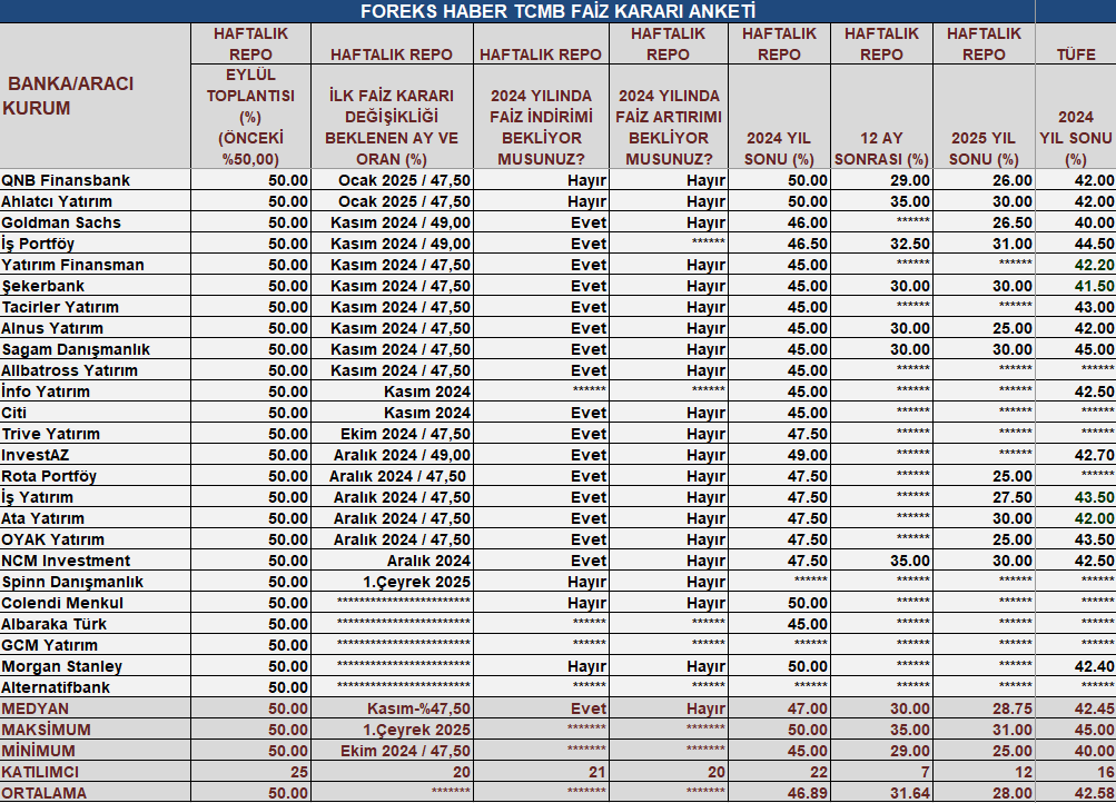 Barclays, Türkiye Cumhuriyet Merkez Bankası'nın (TCMB) ilk faiz indirimini kasım ayında gerçekleştireceğini öngördü. Türkiye Cumhuriyet Merkez Bankası (TCMB) Para Politikası Kurulu (PPK) toplantısı bu ay 19 Eylül 2024 tarihinde yapılacak. Piyasalar eylül ayının pas geçilmesini beklerken Barclays ise faiz indirim patikasına ilişkin yeni bir analiz yayımladı. Buna göre kendilerinin de eylül ayının pas geçilmesini beklediklerini duyuran Barclays Plc ekonomistleri, ilk faiz indiriminin zamanlamasında ise diğer yabancı kurumlardan ayrıştı. Bu kapsamda daha önce ilk indirimi ocak ayında beklediklerini belirten analistler, Türkiye Cumhuriyet Merkez Bankası’nın faiz indirimlerine kasım ayında başlayacağını öngördü. Öte yandan, Ercan Ergüzel’in de aralarında bulunduğu ekonomistler, bugün yayımladıkları Gelişmekte Olan Piyasalar Çeyreklik Raporu’nda, kasım ayındaki ilk faiz indirimi sonrası TCMB’nin her toplantıda 250’şer baz puanla indirimlere devam etmesini, politika faizinin Ağustos 2025’e kadar yüzde 25’e düşürülmesini beklediklerini dile getirdi. HSBC, önden yüklemeli faiz indirimi bekliyor Barclays ekonomistlerinden önce son analiz ise HSBC'den gelmişti. Buna göre HSBC, Türkiye için "önden yüklemeli faiz indirimi" tahmininde bulunmuştu. HSBC CEEMEA Bölgesi Ekonomisti Melis Metiner tarafından hazırlanan 9 Eylül tarihli raporda, bankanın bu yıl için Türkiye'de faiz indirimi olmayacağı yönündeki beklentisini koruduğu, bunun yanında faiz indirimlerinin 2025'te önden yüklemeli olacağını öngördüğü belirtilmişti. [news_id:745203] Yerli aracı kurumların beklentisi ne yönde? Foreks'in bugün açıkladığı faiz beklenti anketi ise yerli kurumların ağırlıklı olarak 2024 yılı içerisinde faiz indirimi beklediklerini gösterdi. Buna göre en erken faiz indirimi bekleyen aracı kurum ekim ayında 250 baz puanlık bir hamle öngören Trive Yatırım olurken, yerli ve yabancı kurumların tahminlerinin medyanı ilk faiz indiriminin kasım ayında beklendiğine işaret etti. Ankete katılan aracı kurumların beklentileri ise şöyle listelendi: Kaynak: Foreks Haber - Faiz Beklenti Anketi