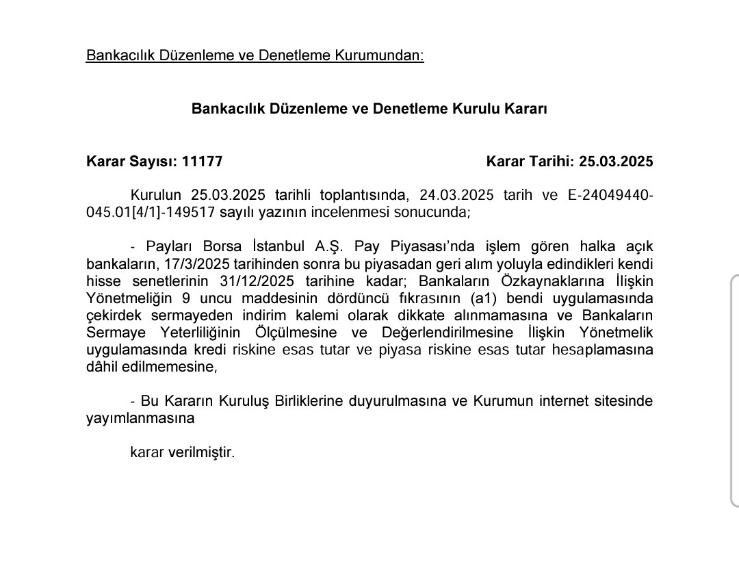 BDDK duyurusuna göre, bankalara hisse geri alımında sermaye esnekliği tanındı. Buna göre bankaların geri alımda aldıkları hisseler çekirdek sermayeden düşmeyecek. Bankalara hisse geri alımında sermaye esnekliği tanındı. Konuya ilişkin Bankacılık Düzenleme ve Denetleme Kurulu (BDDK) kararı şöyle oldu: "Payları Borsa İstanbul A.Ş. Pay Piyasası'nda işlem gören halka açık bankaların, 17/3/2025 tarihinden sonra bu piyasadan geri alım yoluyla edindikleri kendi hisse senetlerinin 31/12/2025 tarihine kadar; Bankaların Özkaynaklarına İlişkin Yönetmeliğin 9 uncu maddesinin dördüncü fıkrasının (a1) bendi uygulamasında çekirdek sermayeden indirim kalemi olarak dikkate alınmamasına ve Bankaların Sermaye Yeterliliğinin Ölçülmesine ve Değerlendirilmesine İlişkin Yönetmelik uygulamasında kredi riskine esas tutar ve piyasa riskine esas tutar hesaplamasına dâhil edilmemesine karar verilmiştir." Kaynak: BDDK [news_id:766354]