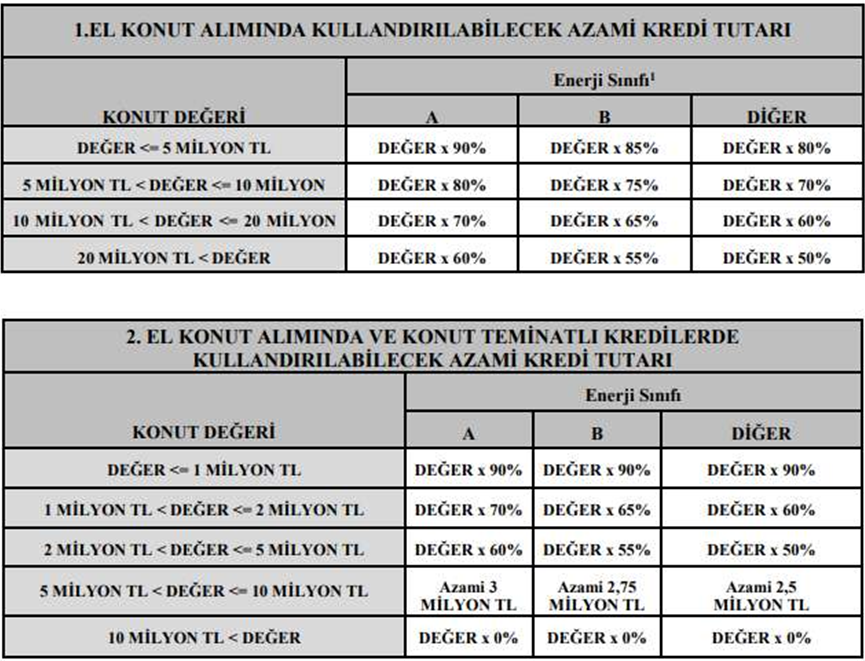 BDDK, konut alımında kullandırılabilecek azami kredi tutarı ve oranlarında değişikliğe gitti. Bankacılık Düzenleme ve Denetleme Kurumu (BDDK) konut kredilerinde limit güncellemesine gitti. Buna göre değeri 5 milyon TL'nin altında olan birinci el konutlarda enerji sınıfına göre değerin yüzde 80 ile yüzde 90'ı arasında azami kredi kullanılabilecek. 5 milyon ile 10 milyon TL arasındaki birinci el konutlarda enerji sınıfına göre yüzde 70 ile yüzde 80 arasında azami kredi kullanılabilecek. İlk elde 10 milyon ile 20 milyon TL arasında ise yüzde 60 ile yüzde 70 arasında azami kredi söz konusu olabilecek. 20 milyon TL'yi aşan ilk el konutlar için ise yüzde 50 ile yüzde 60 azami kredi tutarı uygulanabilecek. BDDK tarafından alınan kararda şöyle denildi: "Kurulun 24.02.2023 tarihli toplantısında, 23.02.2023 tarih ve E-24049440-045.01[4/5]- 77880 sayılı yazı ve ekinin incelenmesi sonucunda; - Bankaların Kredi İşlemlerine İlişkin Yönetmeliğin (Yönetmelik) “Konut, taşıt ve tüketici kredilerine ilişkin sınırlamalar” başlıklı 12/A maddesinin altıncı fıkrası uyarınca, Yönetmeliğin 12/A maddesinin birinci fıkrasında düzenlenen, tüketicilere, konut edinmeleri amacıyla kullandırılacak kredilerde ve taşıt kredileri hariç konut teminatlı kredilerde, kredi tutarının teminat olarak alınan konutun değerine oranının aşağıdaki tabloda yer aldığı şekilde belirlenmesine, Kaynak: Foreks Haber 28.03.2002 tarihli ve 4749 sayılı Kamu Finansmanı ve Borç Yönetiminin Düzenlenmesi Hakkında Kanunun Geçici 37 nci maddesinde düzenlenen “Yeni Konut Finansmanı Programı” kapsamında kullandırılacak kredilerin işbu Karar kapsamında yapılan belirlemelere tabi olmamasına, Bu Kararın Kuruluş Birliklerine duyurulmasına ve Kurumun internet sitesinde yayımlanmasına karar verilmiştir." BDDK'nin ilgili kararına göre, daha önce 2 milyon TL ve altında olan konutlar için belirlenen %90'a kadar kredi kullanım sınırı, 5 milyon TL ve altında olan konutları da kapsamış oldu.