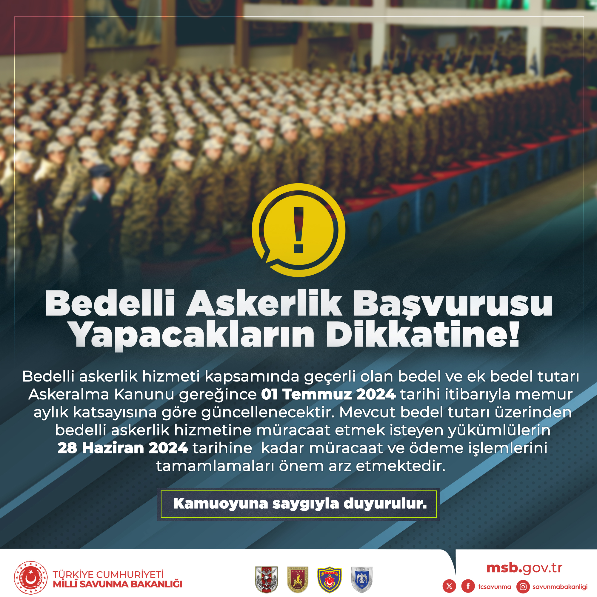 Memur maaş zamlarına endekslenen bedelli askerlik ücreti, temmuz ayında yeniden artış gösterecek. Peki, yeni bedelli askerlik ücretine ilişkin beklentiler ne yönde? İşte detaylar.. 2023 yılının ilk yarısında 104.084,16 TL olan bedelli askerlik ücreti, geçtiğimiz yılın temmuz ayında 122.351,04 TL'ye yükseltilmişti. Bu zamların ardından 2024 yılı başında yüzde 49,25 oranında artışla 122 bin 351 liradan 182 bin 608 liraya yükseltilen ücret, temmuz ayında ise yeniden artırılacak. Yeni ücrete ilişkin beklenti ne yönde? 2024 yılı Temmuz ayında geçerli olacak yeni ücret, memur maaş zammı oranlarına göre hesaplanacak. Bu kapsamda 6 aylık enflasyon farkına göre hesaplanacak memur maaşı zammının ardından Mali ve Sosyal Haklar Genelgesi yayınlanacak ve 2024 yılının ikinci yarısında uygulanacak bedelli askerlik ücreti kesinlik kazanacak. Halk TV'nin haberine göre 3 Temmuz tarihinde haziran enflasyonunun beklentiler doğrultusunda artması durumunda yeni bedelli askerlik ücretinin de 219 bin liraya yükselmesi bekleniyor. [news_id:723032] Bedelli askerlik ücreti nereye yatırılıyor? Bedelli askerlik başvuruları hem askerlik şubelerinden hem de e-Devlet üzerinden gerçekleştirilebiliyor. Başvuruların ardından da ödeme süreci başlıyor. Başvuru şartlarını taşıyan yükümlüler ödemelerini, peşin olarak Ziraat Bankası, Vakıflar Bankası, Halk Bankası, Ziraat Katılım Bankası, Vakıf Katılım Bankası, Defterdarlıklar veya Malmüdürlüklerine T.C. Kimlik Numarası beyan ederek yatırabiliyor. Bedelli askerlik ücretine taksit yapılıyor mu? 7179 sayılı Askeralma Kanunu 9'uncu maddesi ve Askeralma Yönetmeliği'nin 61'inci maddesi gereğince bedelli askerlik hizmeti için belirlenen tutarlar peşin olarak ödenmekte olup taksit yapılamıyor. MSB'den bedelli askerlik tutarı hatırlatması MSB ise bedelli askerlik hizmetinden mevcut bedel tutarından yararlanmak isteyen yükümlülerin müracaat ve ödeme işlemlerini 28 Haziran'a kadar tamamlamalarının önem arz ettiğini duyurdu. Milli Savunma Bakanlığından (MSB) yapılan açıklamada, şunlara yer verildi: "Bedelli askerlik hizmeti kapsamında geçerli olan bedel ve ek bedel tutarı Askeralma Kanunu gereğince 1 Temmuz itibarıyla memur aylık katsayısına göre güncellenecektir. Mevcut bedel tutarı üzerinden bedelli askerlik hizmetine müracaat etmek isteyen yükümlülerin 28 Haziran'a kadar müracaat ve ödeme işlemlerini tamamlamaları önem arz etmektedir." Kaynak: MSB - X