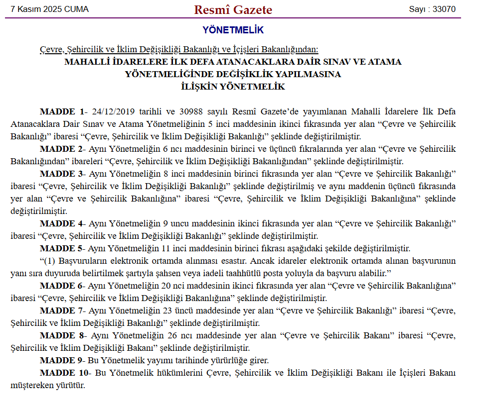 Resmi Gazete'de yayımlanan yeni yönetmelikle belediyelerin memur alımlarında başvuru süreci değişti. İşte yeni dönemin detayları.. Resmi Gazete’nin bugünkü sayısında yayımlanan “Mahalli İdarelere İlk Defa Atanacaklara Dair Sınav ve Atama Yönetmeliğinde Değişiklik Yapılmasına İlişkin Yönetmelik” ile bazı maddelerde güncelleme yapıldı. Yönetmelikte yer alan “Çevre ve Şehircilik Bakanlığı” ibaresi, yeni düzenlemeyle “Çevre, Şehircilik ve İklim Değişikliği Bakanlığı” olarak değiştirildi. Başvurular elektronik ortamda alınacak Değişikliğin dikkat çeken bölümlerinden biri de başvuru süreci oldu. Yönetmeliğin 11’inci maddesi tamamen yenilendi. Yeni maddeye göre, başvuruların elektronik ortamda alınması esas olacak. İdareler isterlerse duyuruda belirtmek şartıyla şahsen ya da iadeli taahhütlü posta yoluyla da başvuru kabul edebilecek. Kaynak: Resmi Gazete