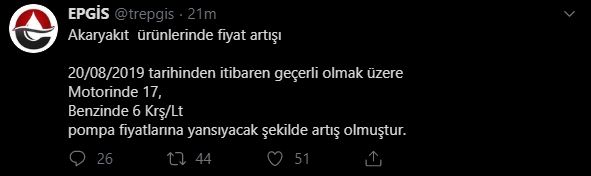 Gece yarısından itibaren motorinin litre fiyatında ortalama 17 kuruş, benzinin litre fiyatında ise 6 kuruş zam yapılacak. Enerji Petrol Gaz İkmal İstasyonları İşveren Sendikasından (EPGİS) alınan bilgiye göre, motorinin litre fiyatında ortalama 17 kuruş, benzinin litre fiyatında ise 6 kuruş zam yapılacak.