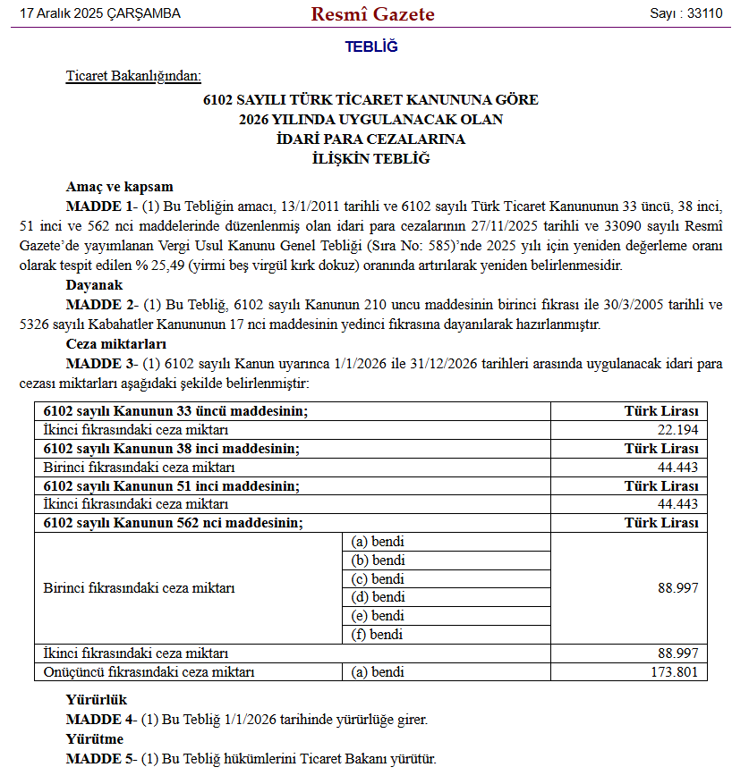 Tescil, bildirim ve defter yükümlülüklerini yerine getirmeyenlere uygulanan ceza tutarları, yeniden değerleme oranı olan yüzde 25,49 dikkate alınarak artırıldı. Ticaret Bakanlığınca hazırlanan "6102 Sayılı Türk Ticaret Kanunu'na Göre 2026 Yılında Uygulanacak Olan İdari Para Cezalarına İlişkin Tebliğ" Resmi Gazete'de yayımlandı. Tebliğle, söz konusu kanunda düzenlenen tescil, bildirim, defter yükümlülüklerini yerine getirmeyenlere uygulanan ceza tutarları, 2025 yılı için yeniden değerleme oranı olarak tespit edilen yüzde 25,49 oranında artırıldı. Buna göre, sicil müdürünce verilen süre içinde tescil isteminde bulunmayan ve kaçınma sebeplerini de bildirmeyen kişiye, sicil müdürünün teklifi üzerine mahallin en büyük mülki amiri tarafından 22 bin 194 lira ceza kesilecek. Tescil ve kayıt için gerçeğe aykırı beyanda bulunanlara, ticaret ünvanı ve işletme adını kullanma zorunluluğunda ilgili maddeleri ihlal edenlere 44 bin 443 lira ceza uygulanacak. Defter tutma yükümlülüğünü yerine getirmeyenlere, belgelerin kopyasını sağlamayanlara, gerekli onayları yaptırmayanlara, ilgili kanunda belirtilen şartlara uygun defterlerini tutmayanlara, usule aykırı olarak envanter çıkaranlara, görüntü ve veri taşıyıcılara aktarılmış belgeleri ibraz etmeyenlere ise 88 bin 997 lira ceza verilecek. Pay senedi bastırılmasına dair madde gereğince, hamiline yazılı paylara ve sahiplerine ilişkin bilgileri, ilgili kuruluşa bildirmeyenlere 173 bin 801 lira ceza kesilecek. Kaynak: Resmi Gazete