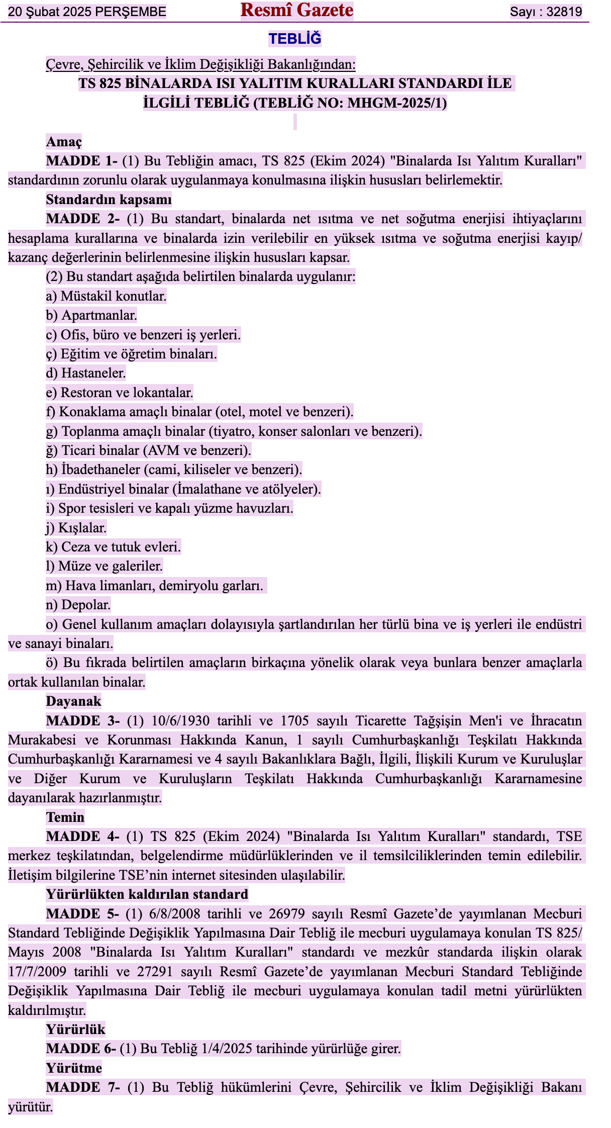 Binalarda enerji verimliliğini arttırmak amacıyla belirlenen "TS 825 Binalarda Isı Yalıtım Kuralları" standardının zorunlu hale getirilmesine ilişkin detaylar Resmî Gazete'de yayımlandı. Özellikle binalarda net ısıtma ve soğutma enerjisi ihtiyaçlarının hesaplanması, izin verilebilir en yüksek enerji kayıplarının belirlenmesi gibi konuları kapsam altına alan standart artık farklı bina türlerini de içerecek şekilde uygulanacak. Standardın Kapsamı ve Uygulanacak Alanlar "TS 825 Binalarda Isı Yalıtım Kuralları" standardı, binalarda net ısıtma ve soğutma enerjisi ihtiyacının hesaplanmasına ilişkin kurallar ile binalarda izin verilebilir en yüksek ısıtma ve soğutma enerjisi kayıp-kazancı değerlerini belirleme konularını kapsıyor. Şartlandırılmış her tür bina ve işyeri ile endüstri ve sanayi binaları dâhil olmak üzere, konutlardan ticari binalara, eğitim yapılarından sağlık tesislerine kadar geniş bir yelpazede uygulanacak. Bu kapsamda; münferit konutlardan apartmanlara, ofis ve işyeri binalarından hastanelere, restoranlardan otellere, tiyatro ve konser salonlarından spor tesislerine kadar pek çok bina bu standarda tabi olacak. Aynı zamanda hava limanları, demiryolu garları, depolar, ceza ve tutuk evleri gibi yapılar da bu kapsama alınıyor. Dayanak ve Yürülüğe Giriş Tarihi 10/6/1930 tarihli ve 1705 sayılı Ticarette Tağşişin Men'i ve İhracatın Murakabesi ve Korunması Hakkında Kanun, 1 sayılı Cumhurbaşkanlığı Teşkilatı Hakkında Cumhurbaşkanlığı Kararnamesi ve 4 sayılı Bakanlıklara Bağlı, İlgili, İlişkili Kurum ve Kuruluşlar ve Diğer Kurum ve Kuruluşların Teşkilatı Hakkında Cumhurbaşkanlığı Kararnamesine dayanılarak hazırlanan bu yeni düzenleme, 1/4/2025 tarihinde yürülüğe girecek. Daha önce 6/8/2008 tarihli ve 26979 sayılı Resmî Gazete'de yayımlanan Mecburi Standard Tebliğinde Değişiklik Yapılmasına Dair Tebliğ ile zorunlu hale getirilen TS 825/Mayıs 2008 standardı ve buna ilişkin olarak 17/7/2009 tarihli ve 27291 sayılı Resmî Gazete'de yayımlanan Mecburi Standard Tebliğinde Değişiklik Yapılmasına Dair Tebliğ yürülükten kaldırılacak. Standarda Ulaşım ve Yürütlmesi Yeni "TS 825 Binalarda Isı Yalıtım Kuralları" standardı, TSE merkez teşkilatı, belgelendirme müdürlükleri ve il temsilcilikleri aracılığıyla temin edilebilecek olup, ilgililer detaylı bilgilere TSE’nin resmî internet sitesi üzerinden erişebilir. Tebliğ hükümlerini Çevre, Şehircilik ve İklim Değişikliği Bakanı yürütecek. TS 825 nedir? TS 825 standardı, Türkiye'de binalarda ısı yalıtımı ile ilgili esasları belirleyen bir standarttır. Türk Standartları Enstitüsü (TSE) tarafından yayımlanan bu standart, binaların enerji verimliliğini artırmak, ısı kayıplarını azaltmak ve yakıt tüketimini düşürmek amacıyla hazırlanmıştır. TS 825 Standardının Kapsamı Binalarda ısı yalıtımı hesaplama yöntemleri belirlenir. Isı iletim katsayıları (U değerleri) tanımlanır. Çatı, duvar, döşeme ve pencere gibi yapı elemanlarının ısı yalıtımı şartları açıklanır. Bölgelere göre iklim verileri dikkate alınarak bina enerji ihtiyacı hesaplanır. Mekanik sistemler ve havalandırma ile ilgili ısı kayıpları değerlendirilir. TS 825 Isı Yalıtımı Standardının Önemi Enerji tasarrufu sağlar: Isı yalıtımı sayesinde ısınma ve soğutma giderleri düşer. Konfor seviyesini artırır: İç ortam sıcaklık dalgalanmaları azalır. Çevresel etkileri azaltır: Daha az fosil yakıt tüketimi ile karbon salınımı düşer. Yönetmeliklere uyumu sağlar: TS 825, binaların Enerji Kimlik Belgesi (EKB) alabilmesi için gereklidir. Bu standart, özellikle yeni yapılan binalarda zorunlu olup, mevcut binaların enerji verimliliği artırılmak istendiğinde de referans alınır. Türkiye'deki iklim bölgelerine göre farklı U değerleri belirlenerek her bölge için uygun ısı yalıtım kalınlıkları hesaplanır. Bölgelere Göre U Değerleri Sınırları TS 825, Türkiye’yi 4 iklim bölgesine ayırır ve her bölge için maksimum U değerlerini belirler. Eğer hesaplanan U değerleri, ilgili bölgedeki maksimum sınır değerlerinden büyükse, daha iyi yalıtım sağlanması gerekir. Isı Köprüleri ve Hava Sızdırmazlığı TS 825, ısı köprülerini (pencere kenarları, kolon-kiriş birleşimleri gibi ısı kaçış noktaları) minimuma indirmeyi önerir. Ayrıca - Binaların hava sızdırmazlığının artırılması (Kapı-pencere sızdırmaz bantları gibi) - Isı kayıplarını önlemek için cephe detaylarının iyileştirilmesi gerekmektedir.