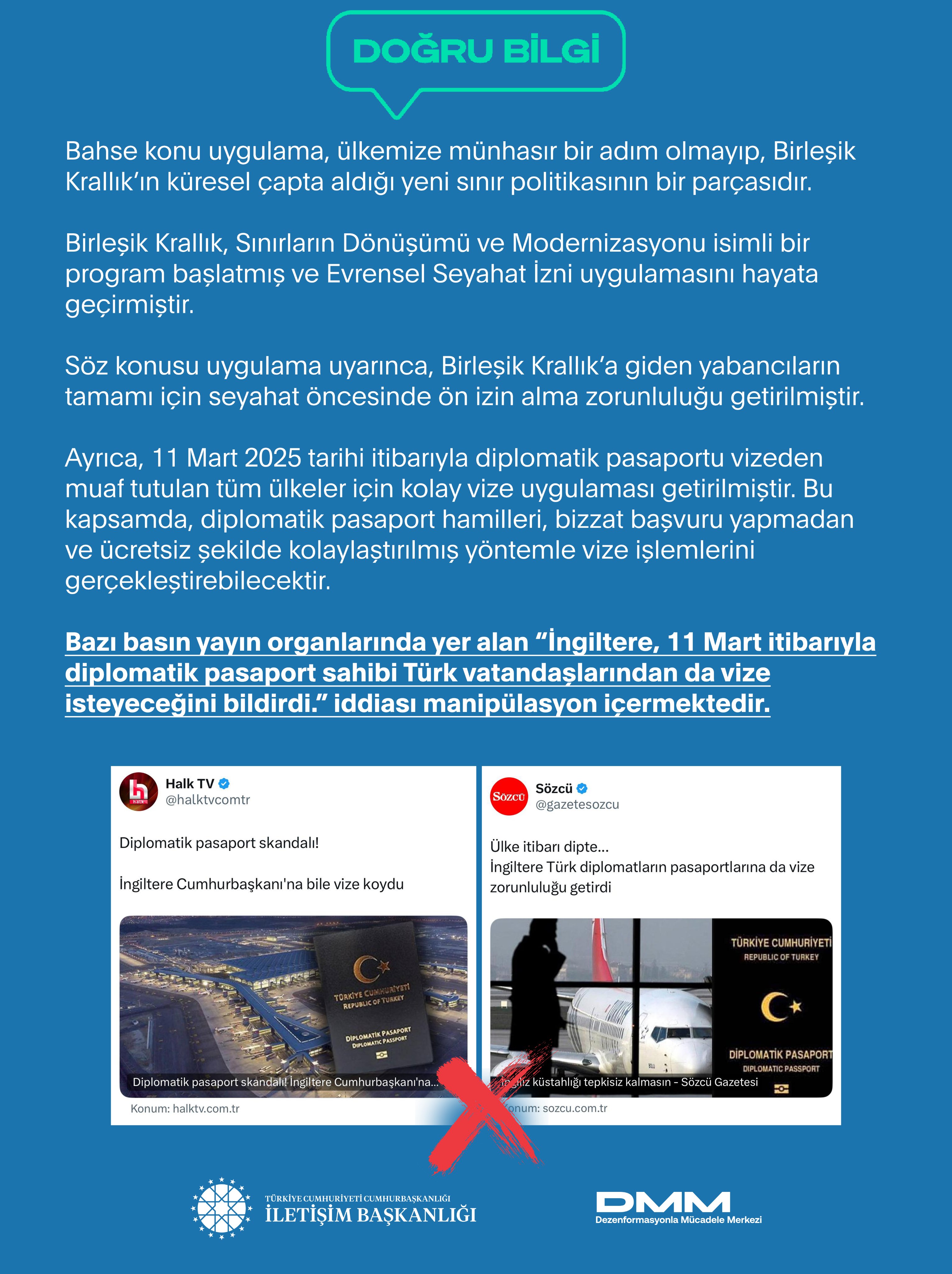 Birleşik Krallık 11 Mart 2025 tarihinde yürürlüğe girecek vize düzenlemesiyle ülkesine gelecek kişilerden ön kayıt isteyeceğini açıkladı. Birleşik Krallık, 'Sınırların Dönüşümü ve Modernizasyonu' isimli programı kapsamında 'Evrensel Seyahat İzni' (Universal Permission to Travel) uygulamasını hayata geçirdi. Yeni uygulamada, Birleşik Krallık'a gelen yabancıların tamamı için seyahat öncesinde ön izin alma zorunluluğu getirildi. Bu doğrultuda, 2 Nisan 2025 tarihinden itibaren vizeye tabi olmayan ülkelerin (AB ve ABD gibi) pasaport sahiplerinin Birleşik Krallık'a seyahatleri öncesinde 'Elektronik Seyahat İzni'ne (Electronic Travel Authorisation-ETA) başvurmaları zorunlu kılındı. DMM: Türkiye'ye yönelik bir karar gibi yansıtılmaya çalışıyor Basında yer alan haberlerde ise İngiltere'nin diplomatik pasaport sahibi Türk vatandaşlarından vize talep edeceği bildirilmişti. Dezenformasyonla Mücadele Merkezi de bu haberlerin ardından yaptığı açıklamada, “İngiltere, 11 Mart itibarıyla diplomatik pasaport sahibi Türk vatandaşlarından da vize isteyeceğini bildirdi.” iddiasının manipülasyon içerdiğini bildirdi. Konuya ilişkin yapılan açıklamada şunlar aktarıldı: "Bahse konu uygulama, ülkemize münhasır bir adım olmayıp, Birleşik Krallık’ın küresel çapta aldığı yeni sınır politikasının bir parçasıdır. Birleşik Krallık, Sınırların Dönüşümü ve Modernizasyonu isimli bir program başlatmış ve Evrensel Seyahat İzni uygulamasını hayata geçirmiştir. Söz konusu uygulama uyarınca, Birleşik Krallık’a giden yabancıların tamamı için seyahat öncesinde ön izin alma zorunluluğu getirilmiştir. Ayrıca, 11 Mart 2025 tarihi itibarıyla diplomatik pasaportu vizeden muaf tutulan tüm ülkeler için kolay vize uygulaması getirilmiştir. Bu kapsamda, diplomatik pasaport hamilleri, bizzat başvuru yapmadan ve ücretsiz şekilde kolaylaştırılmış yöntemle vize işlemlerini gerçekleştirebilecektir." Kaynak: DMM
