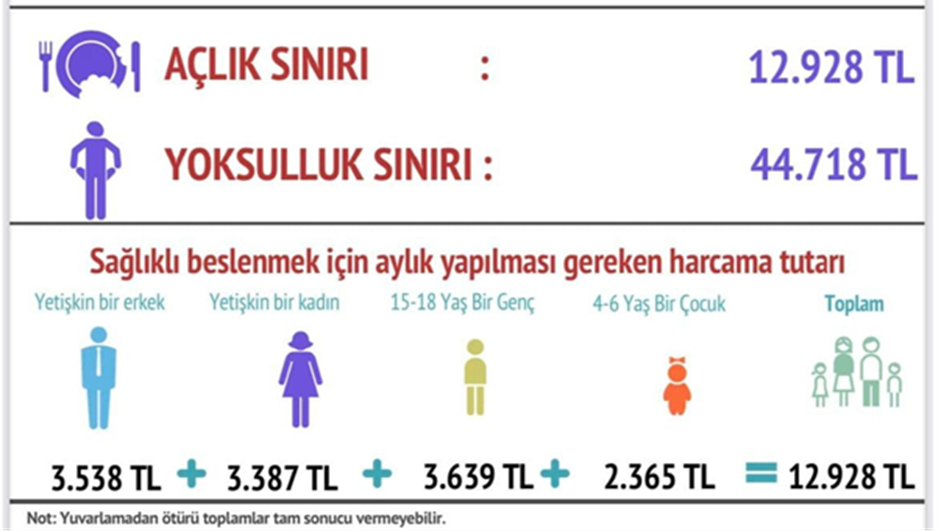 BİSAM'ın açlık ve yoksulluk sınırı raporuna göre Türkiye'de dört kişilik bir aile için açlık sınırı ekimde 12 bin 928 TL’ye, yoksulluk sınırı ise 44 bin 718 TL’ye çıktı. DİSK Birleşik Metal-İş Sınıf Araştırmaları Merkezi (BİSAM) Ekim 2023 dönemi açlık ve yoksulluk sınırı raporunu açıkladı. Buna göre ekim ayı itibarıyla, dört kişilik bir ailenin aylık mutfak harcamasını kapsayan açlık sınırı 12 bin 928 TL’ye; eğitim, sağlık, barınma, eğlence, ısınma ve ulaşım giderlerini kapsayan yoksulluk sınırı ise 44 bin 718 TL’ye ulaştı. Kaynak: BİSAM BİSAM verilerine göre eylülde ise açlık sınırı 12 bin 612 TL, yoksulluk sınırı 43 bin 623 TL olmuştu. BİSAM’dan yapılan yazılı açıklamada, ekim ayında sağlıklı ve dengeli beslenmenin günlük maliyetinin ise 430 TL’yi aştığı belirtildi. Kaynak: BİSAM Bir gencin aylık gıda harcaması 3.639 TL Yetişkin bir erkeğin sağlıklı ve dengeli beslenmesi için tüketmesi gereken gıdaların aylık karşılığı ise 3 bin 538 TL oldu. Bu değer, yetişkin bir kadın için 3 bin 387, 15-18 yaş bir genç için 3 bin 639, 4-6 yaş arası bir çocuk için 2 bin 365 TL oldu. Kaynak: BİSAM