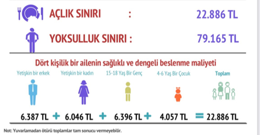 DİSK Birleşik Metal-İş Sınıf Araştırmaları Merkezi hesaplamasına göre şubat ayında dört kişilik bir aile için açlık sınırı 22 bin 886 TL olurken, yoksulluk sınırı 79 bin 165 TL’ye çıktı. DİSK Birleşik Metal-İş Sınıf Araştırmaları Merkezi (BİSAM), şubat ayına ilişkin açlık ve yoksulluk sınırı araştırmasının sonuçlarını yayımladı. Sağlıklı ve dengeli beslenmek için her aile ferdinin alması gereken kalori miktarı farklılık gösterirken, Şubat 2025 dönemi için yetişkin bir erkeğin sağlıklı ve dengeli beslenmesi için tüketmesi gereken gıdaların aylık karşılığı 6.387 lira, yetişkin bir kadın için 6.046, 15-18 yaş bir genç için 6.396, 4-6 yaş arası bir çocuk için 4.057 lira olarak hesaplandı. Sağlıklı bir biçimde beslenmenin toplam aile bütçesine maliyeti ise 22 bin 886 lira olarak tespit edildi. Eğitim, sağlık, barınma, eğlence, ısınma, ulaşım gibi giderler ile birlikte bir ailenin yapması gereken harcama tutarı da 79 bin 165 lira olarak belirlendi. Kaynak: BİSAM Tek başına yaşayan bir kişinin sağlıklı ve dengeli beslenmesi için yapması gereken mutfak harcamaları ile yaşamını idame ettirmek için yapması gereken barınma, ulaşım, eğitim, sağlık vb. harcamalarının toplam tutarının ise en az 36.681 lira olduğu aktarıldı. [news_id:764083]