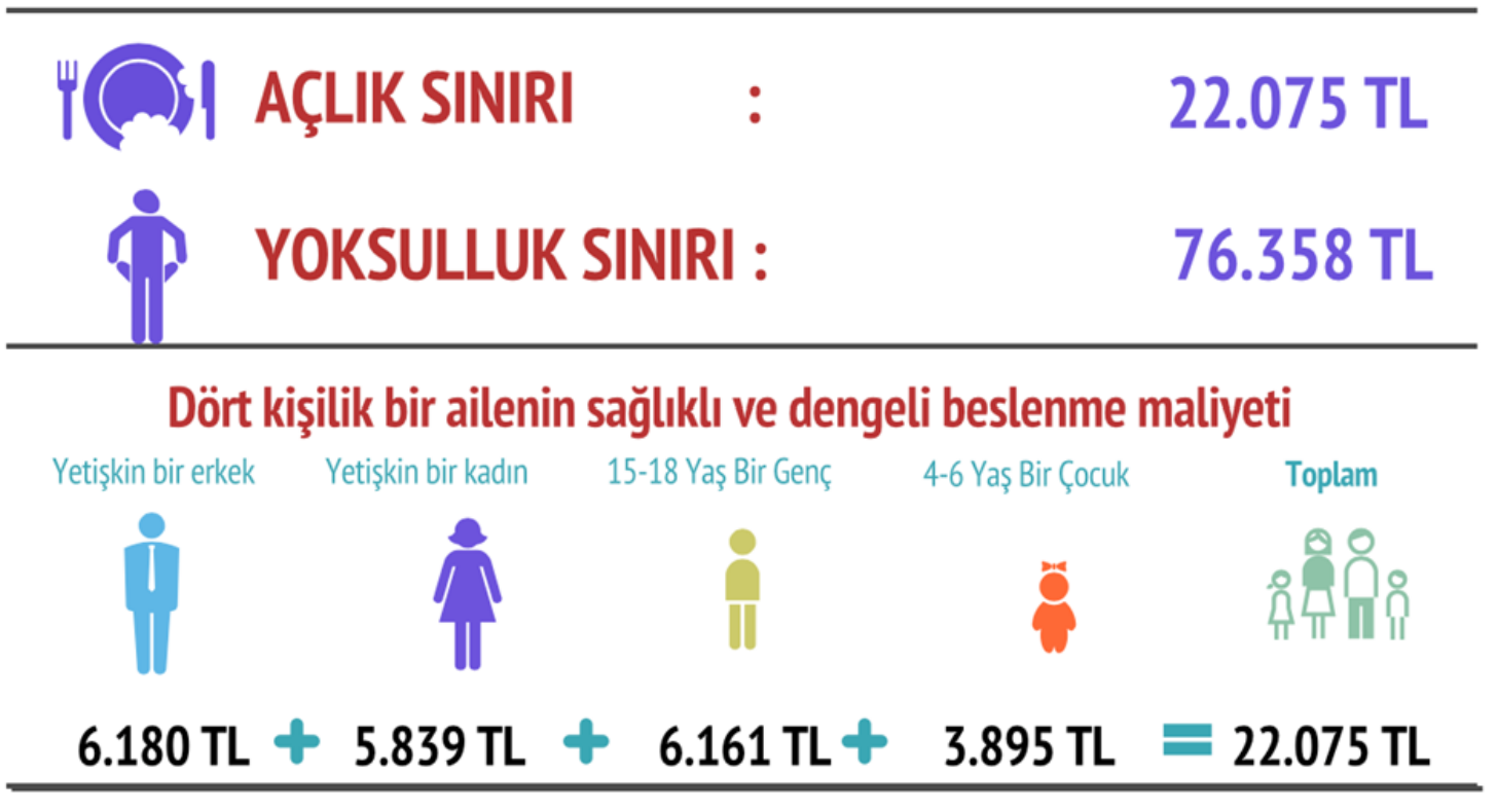 BİSAM’ın araştırmasına göre 2025 yılının ilk ayında dört kişilik bir ailenin açlık sınırı 22 bin 75 TL’ye, yoksulluk sınırı ise 76 bin 358 TL’ye çıktı. DİSK Birleşik Metal-İş Sınıf Araştırmaları Merkezi (BİSAM) Ocak 2025 dönemine ilişkin açlık yoksulluk sınırı raporunu açıkladı. BİSAM'ın yaptığı hesaplamaya göre dört kişilik bir ailenin sağlıklı ve dengeli beslenmesi için aylık yapması gereken gıda harcamaları tutarı (açlık sınırı) Ocak 2025 için 22 bin 75 TL oldu. Açlık sınırı üzerinden hanehalkı tüketim harcamaları esas alınarak yapılan hesaplama sonuçlarına göre ise yoksulluk sınırı 76 bin 358 TL olarak hesaplandı. Yetişkin bir erkeğin sağlıklı ve dengeli beslenmesi için tüketmesi gereken gıdaların aylık karşılığı da 6 bin 180 TL olarak belirlendi. Bu değer yetişkin bir kadın için 5 bin 839 TL, 15-18 yaş bir genç için 6 bin 161 TL, 4-6 yaş arası bir çocuk için ise 3 bin 895 TL seviyesinde ölçüldü. Kaynak: BİSAM En çok maliyet meyve sebze grubunda Günlük harcamalarda Ocak 2025'te en yüksek maliyeti 207,46 liralık harcama gereksinimi ile meyve sebze grubu oluşturdu. İkinci en yüksek maliyetli harcama grubu 196,43 liralık harcama gereksinimi ile süt ve süt ürünlerinde olurken, et, tavuk ve balık grubu için yapılması gereken minimum harcama tutarı 140,71 lira olarak belirlendi. Ekmek için günlük 69,83 lira, katı yağ ve sıvı yağ için ise günlük 37,43 lira harcama yapılması gerektiği görüldü. Kaynak: BİSAM TÜRK-İŞ daha yüksek açıklamıştı TÜRK-İŞ ise Ocak 2025 için açlık sınırı rakamını daha yüksek açıklamıştı. Buna göre TÜRK-İŞ, Ankara’da dört kişilik bir ailenin sağlıklı ve dengeli beslenmesi için harcaması gereken miktarın 22.131,06 TL olduğunu bildirmişti. [news_id:761699]