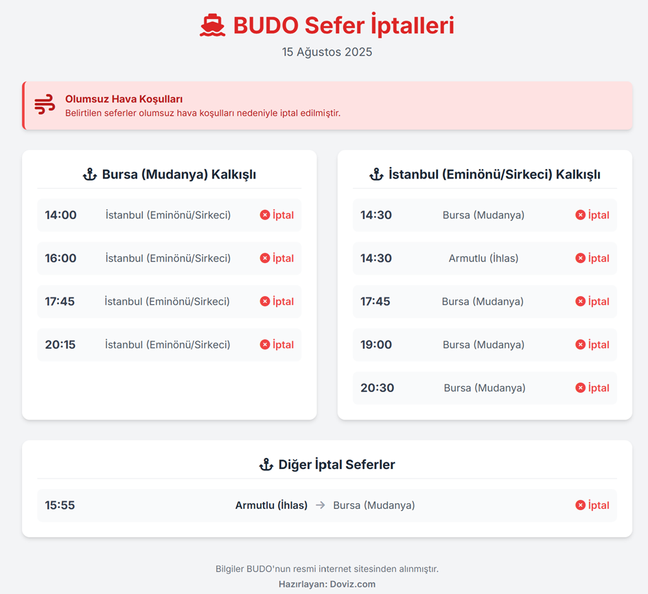 Bursa Büyükşehir Belediyesince Bursa ile İstanbul ve Yalova arasında işletilen deniz otobüslerinin 10 seferi, olumsuz hava koşulları nedeniyle iptal edildi. Bursa Deniz Otobüsleri'nin (BUDO) internet sitesindeki duyuruya göre, saat 14.00'teki Bursa (Mudanya)-İstanbul (Eminönü/Sirkeci), saat 14.30'daki İstanbul (Eminönü/Sirkeci)-Bursa (Mudanya), saat 14.30'daki İstanbul (Eminönü/Sirkeci)-Armutlu (İhlas), saat 15.55'teki Armutlu (İhlas)-Bursa (Mudanya), saat 16.00'daki Bursa (Mudanya)-İstanbul (Eminönü/Sirkeci), saat 17.45'teki İstanbul (Eminönü/Sirkeci)-Bursa (Mudanya), saat 17.45'teki Bursa (Mudanya)-İstanbul (Eminönü/Sirkeci), saat 19.00'daki İstanbul (Eminönü/Sirkeci)-Bursa (Mudanya), saat 20.15'teki Bursa (Mudanya)-İstanbul (Eminönü/Sirkeci) ile saat 20.30'daki İstanbul (Eminönü/Sirkeci)-Bursa (Mudanya) seferleri, olumsuz hava koşulları nedeniyle iptal edildi. [news_id:781803]