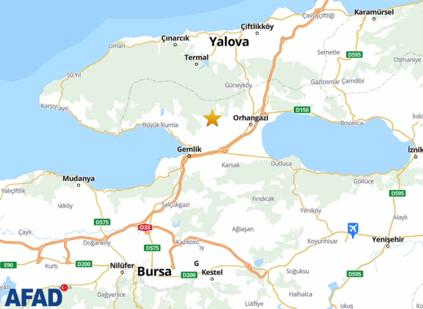 AFAD, Bursa'da 4,2 büyüklüğünde deprem olduğunu bildirdi. Afet ve Acil Durum Yönetimi Başkanlığının (AFAD) internet sitesinde yer alan bilgiye göre saat 12.57'de Bursa'da deprem meydana geldi. Yerin 10,14 km altında gerçekleşen depremin büyüklüğü 4,2 olarak açıklandı. Depremin merkez üssünün ise Gemlik olduğu bildirildi. Gemlik'te saat 11.47 civarında 3.9 büyüklüğünde bir deprem daha olmuştu. Kaynak: AFAD