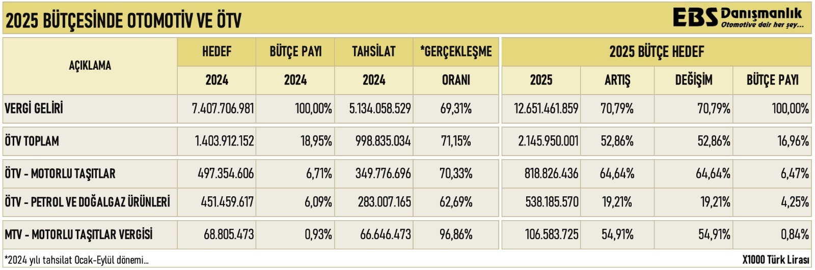 Meclis’e sunulan 2025 bütçe teklifinde otomotivden tahsil edilecek ÖTV gelirinin %64,4 artış kaydedeceği öngörülüyor. Sektör temsilcileri ise bu oranda bir tahsilat için satışların 1,2 milyonu aşmasının ya da matrahların değişmediği düşünüldüğünde yeni ÖTV dilimlerinin eklenmesinin gerekebileceğini söylüyor. Meclis’e sunulan 2025 bütçe teklifinde, otomotivden tahsil edilecek ÖTV gelirinin önümüzdeki yıl %64,4 artışla 818,8 milyar TL’ye ulaşacağı öngörüldü. Bu yılki 497 milyar TL’lik hedefe ulaşılmasının bile zor olduğunu belirten uzmanlar ise 819 milyar TL’lik bu hedefe ulaşılması için ÖTV’de yeni dilimlerin eklenebileceğini söyledi. Buna göre otomotiv gazetecisi Emre Özpeynirci, konuyu bugünkü köşe yazısına taşıyarak şunları aktardı: “1.283.952 adetle Cumhuriyet tarihinin en yüksek araç satışının yapıldığı 2023 yılında hükümetin motorlu taşıtlardan tahsil ettiği ÖTV geliri yüzde 164 artarak 441 milyar TL’ye ulaştı. Böylece ek bütçe dahil konan 346 milyar TL’lik tahsilat hedefi %127 oranında tutmuş oldu. Nasıl tutmasın ki? Son 2 yıldır matrahlar güncellenmediği için Türkiye’de en ucuz otomobilin ÖTV’si yüzde 80’den başlıyor, KDV eklendiğinde vergi yükü yüzde 116’a çıkıyor, otomobil fiyatları artıkça da vergi gelirleri katlanarak büyüyor. 2023’teki 441 milyar TL’lik bu rekor ÖTV tahsilatının ardından 2024 yılına 497 milyar TL’lik ÖTV gelir hedefiyle giren hükümet 9 ay sonunda 311 milyar TL ile bu hedefin ancak yüzde 70’ine ulaştı. Gerilemeye başlayan otomotiv pazarı ve ÖTV tahsilatıyla 2024 hedefi yıl sonunda tutar mı, hep birlikte göreceğiz. Ama en azından toplam pazar 2023’e yakın seyrettiği için hedefe yakın bir tahsilat yapılacağı açık. Kaynak: Emre Özpeynirci Ama 2025 yılı bütçe teklifinin TBMM’ye sunulmasıyla birlikte, önümüzdeki yıl hedeflenen ÖTV tahsilatı tam anlamıyla kafaları karıştırdı. Çünkü Meclis’e sunulan 2025 bütçe teklifine göre, motorlu taşıtlardan tahsil edilecek ÖTV gelirinin %64,4 artışla 818,8 milyar TL’ye ulaşması bekleniyor. Pazarın üç aşağı beş yukarı 1,1 milyon adedi aşacağı belli olan 2024 yılında henüz 497 milyar TL’lik hedefin tutacağı bile belli olmamışken, 2025 yılında yüzde 64,4’lük ÖTV artışı beklentisi, ‘acaba yeni vergi artışları mı hedefleniyor?’ sorusunu gündeme getiriyor. Bakanlığın 2025 yılında otomotiv pazarına ilişkin beklentisinin çok iyimser olduğu ortada. Ama ÖTV tahsilat hedefinin yüzde 64 artırılması gerçekten şaşırtıcı. Yeni dilimler eklenebilir EBS Danışmanlık Genel Müdürü Erol Şahin, “Bu durumda akıllara ÖTV matrahlarının daha uzun yıllar güncellenmeyeceği ve yeni dilimler eklenerek bir artış geleceği geliyor. Ayrıca bu tahsilat için pazarın yeniden 1,2 milyonu aşması gerekiyor. Hele ki enflasyon hedefinin %25-30 olduğu düşünülünce” yorumunu yapıyor.” [news_id:748742]