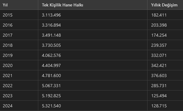 Türkiye’de tek kişilik hane halkı sayısı 2024 itibarıyla 5 milyon 321 bin 540’a ulaşarak son 10 yılda yüzde 71 oranında artış gösterdi. İstanbul, 943 bin 363 kişiyle en fazla yalnız yaşayan bireye sahip şehir olurken Ankara, İzmir, Antalya ve Bursa gibi büyükşehirler de listede üst sıralarda yer aldı. Türkiye İstatistik Kurumu (TÜİK) verilerine göre, aynı adreste yaşayan ve aralarında akrabalık bağı olup olmamasına bakılmaksızın hane halkı olarak tanımlanan toplulukların toplam sayısı 26 milyon 599 bin 261 olarak kaydedildi. Tek kişilik hane halkı sayısı ise 2015 yılından bu yana sürekli yükseliş gösterdi ve 2024 itibarıyla 5,3 milyonu aştı. Son 10 Yılda Yalnız Yaşayanların Sayısındaki Değişim 2015 yılında 3 milyon 113 bin 496 kişi yalnız yaşarken bu rakam her yıl artarak 2020 yılında 4 milyon 404 bin 997’ye yükseldi. Kovid-19 salgınının etkili olduğu bu dönemde, yalnız yaşayan bireylerin sayısı 342 bin 421 kişi arttı. 2021 yılında bu artış hız kazandı ve 376 bin 603 kişinin daha yalnız yaşamasıyla sayı 4 milyon 781 bin 600’e ulaştı. Sonraki yıllarda artış devam etti ve 2022’de 285 bin 731 artışla 5 milyon 67 bin 331’e, 2023’te ise 125 bin 494 artışla 5 milyon 192 bin 825’e yükseldi. 2024 yılında tek kişilik hane sayısı 128 bin 715 kişi daha artarak 5 milyon 321 bin 540’a ulaştı. Aşağıdaki tablo, 2015-2024 yılları arasındaki değişimi gösteriyor: Büyükşehirlerde Yalnız Yaşayanların Sayısı Yükseliyor Tek başına yaşayan bireyler en çok büyükşehirlerde yoğunlaşırken İstanbul, 943 bin 363 kişiyle yalnız yaşayanların en fazla bulunduğu şehir oldu. Ankara’da 384 bin 201, İzmir’de 363 bin 110, Antalya’da 197 bin 923 ve Bursa’da 184 bin 559 kişi tek başına yaşamını sürdürdü. Bursa’nın ardından Adana 123 bin 940 kişiyle, Mersin 119 bin 750 kişiyle, Balıkesir 119 bin 432 kişiyle, Konya 118 bin 166 kişiyle ve Kocaeli 106 bin 912 kişiyle yalnız yaşayanların yoğun olduğu şehirler arasında yer aldı. Türkiye genelinde yalnız yaşayan bireylerin yarısından fazlası 10 büyükşehirde ikamet etti. Yalnız Yaşayanların En Az Olduğu İller Türkiye genelinde en az yalnız yaşayan iller ise Bayburt, Ardahan ve Hakkari oldu. Bayburt’ta yalnız yaşayan kişi sayısı 5 bin 754 olarak belirlenirken, Ardahan’da 6 bin 953 ve Hakkari’de 8 bin 91 kişi tek başına hayatını sürdürdü. Türkiye genelinde hane yapısındaki değişim, bireylerin giderek daha fazla yalnız yaşamayı tercih ettiğini gösterirken, bu eğilim büyükşehirlerde daha belirgin hale geldi. Sonuç: Türkiye’de Yalnız Yaşam Yaygınlaşıyor Son 10 yılda tek kişilik hane halkı sayısında yaşanan yüzde 71’lik artış, Türkiye’de sosyal yapının değiştiğini ortaya koydu. Kovid-19 salgını, şehirleşme, bireysel özgürlük arayışı ve ekonomik faktörler, yalnız yaşamayı tercih eden bireylerin sayısının artmasında önemli rol oynadı. Büyükşehirlerde yalnız yaşayanların oranı hızla yükselirken, kırsal kesimlerde ise aile odaklı yaşam modeli korunmaya devam etti. Önümüzdeki yıllarda yalnız yaşam trendinin daha da artması beklenirken, bu değişim şehirleşme politikalarından ekonomik planlamalara kadar birçok alanda etkisini gösterecek.