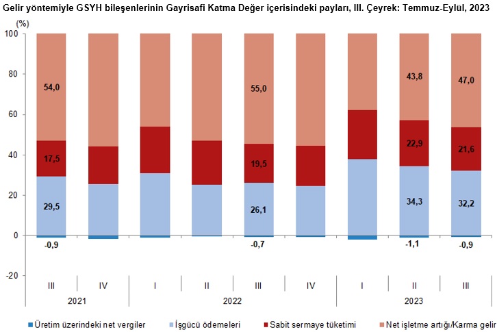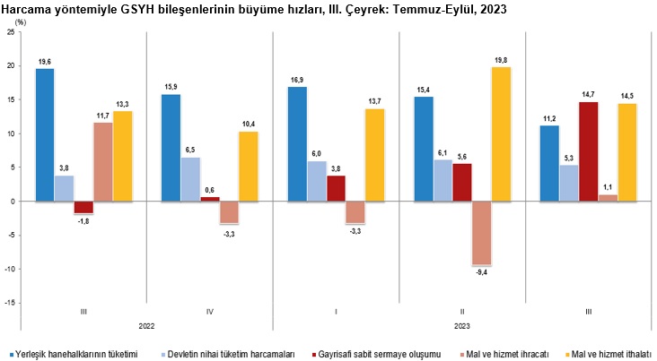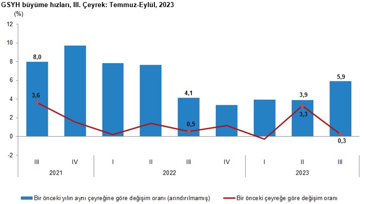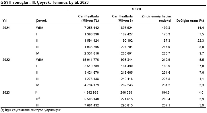 Türkiye İstatistik Kurumu (TÜİK), 2023 yılının üçüncü çeyreğine ilişkin Gayrisafi Yurt içi Hasıla verilerini açıkladı. TÜİK’in açıkladığı verilere göre ekonomi üçüncü çeyrekte yıllık bazda yüzde 5,9 büyüme kaydetti. Üçüncü çeyreğe ilişkin piyasaların genel beklentisi ise yüzde 5,6 büyüme gerçekleşmesi yönündeydi. Bahçeşehir Üniversitesi Ekonomik ve Toplumsal Araştırmalar Merkezi (BETAM) ise GSYH öncü göstergeleri ile yaptığı hesaplamalarda üçüncü çeyrek için yüzde 6,4 oranında büyüme beklemiş, mevsim ve takvim etkilerinden arındırılmış verilerle yapılan hesaplamalarla ise bir önceki çeyreğe kıyasla GSYH’nin yüzde 1,3 artacağını öngörmüştü. AA Finans'ın anket sonuçlarına göre ise ekonomistler bu yılın üçüncü çeyreğinde Türkiye ekonomisinin yüzde 5,19 büyüdüğünü tahmin etmiş; ankete katılan ekonomistlerin beklentileri de yüzde 4,10 ile yüzde 6,00 aralığında yer almıştı. Türkiye ekonomisi 2023 yılının ilk çeyreğinde yüzde 4 büyüme kaydederken, yılın ikinci çeyreğinde yüzde 3,8 büyümüştü. [article_id:184] TÜİK bülteninde ise büyüme verilerine ilişkin şunlar paylaşıldı: GSYH'yi oluşturan faaliyetler incelendiğinde; 2023 yılı üçüncü çeyreğinde bir önceki yıla göre zincirlenmiş hacim endeksi olarak; inşaat %8,1, sanayi %5,7, finans ve sigorta faaliyetleri %5,1, hizmetler %4,3, kamu yönetimi, eğitim, insan sağlığı ve sosyal hizmet faaliyetleri %3,6, gayrimenkul faaliyetleri %2,7, diğer hizmet faaliyetleri %2,2, bilgi ve iletişim faaliyetleri %1,7 ve tarım sektörü %0,3 artarken mesleki, idari ve destek hizmet faaliyetleri %2,5 azaldı. Ürün üzerindeki vergiler eksi sübvansiyonlar ise %16,5 arttı. Kaynak: TÜİK Mevsim ve takvim etkilerinden arındırılmış GSYH zincirlenmiş hacim endeksi, bir önceki çeyreğe göre %0,3 arttı. Takvim etkisinden arındırılmış GSYH zincirlenmiş hacim endeksi, 2023 yılı üçüncü çeyreğinde bir önceki yılın aynı çeyreğine göre %5,1 arttı. Kaynak: TÜİK GSYH 2023 yılının üçüncü çeyreğinde cari fiyatlarla 7 trilyon 681 milyar 432 milyon TL oldu Üretim yöntemiyle Gayrisafi Yurt İçi Hasıla tahmini, 2023 yılının üçüncü çeyreğinde cari fiyatlarla bir önceki yılın aynı çeyreğine göre %79,8 artarak 7 trilyon 681 milyar 432 milyon TL oldu. GSYH'nin üçüncü çeyrek değeri cari fiyatlarla ABD doları bazında 295 milyar 815 milyon olarak gerçekleşti. Kaynak: TÜİK Hanehalkı nihai tüketim harcamaları 2023 yılının üçüncü çeyreğinde %11,2 arttı Yerleşik hanehalklarının nihai tüketim harcamaları 2023 yılının üçüncü çeyreğinde bir önceki yılın aynı çeyreğine göre zincirlenmiş hacim endeksi olarak %11,2 arttı. Devletin nihai tüketim harcamaları %5,3, gayrisafi sabit sermaye oluşumu ise %14,7 arttı. Mal ve hizmet ithalatı 2023 yılı üçüncü çeyreğinde %14,5, ihracatı ise %1,1 arttı Mal ve hizmet ithalatı, 2023 yılının üçüncü çeyreğinde bir önceki yılın aynı çeyreğine göre zincirlenmiş hacim endeksi olarak %14,5, ihracatı ise %1,1 arttı. Kaynak: TÜİK İşgücü ödemeleri 2023 yılı üçüncü çeyreğinde %117,2 arttı İşgücü ödemeleri, 2023 yılının üçüncü çeyreğinde bir önceki yılın aynı çeyreğine göre %117,2 arttı. Net işletme artığı/karma gelir %50,7 arttı. İşgücü ödemelerinin Gayrisafi Katma Değer içerisindeki payı %32,2 oldu İşgücü ödemelerinin cari fiyatlarla Gayrisafi Katma Değer içerisindeki payı geçen yılın üçüncü çeyreğinde %26,1 iken, bu oran 2023 yılında %32,2 oldu. Net işletme artığı/karma gelirin payı ise %55,0 iken %47,0 oldu. Kaynak: TÜİK Bu konu ile ilgili bir sonraki haber bülteninin yayımlanma tarihi 29 Şubat 2024'tür.