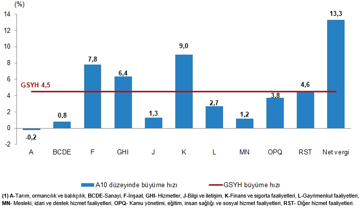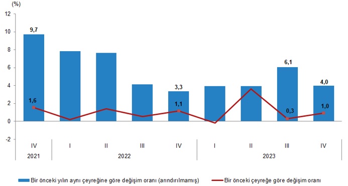 Türkiye İstatistik Kurumu (TÜİK), 2023 yılına ilişkin Gayrisafi Yurt içi Hasıla verilerini açıkladı. TÜİK’in açıkladığı verilere göre ekonomi dördüncü çeyrekte yıllık bazda %4 büyüme kaydetti. Bu döneme ilişkin piyasaların genel beklentisi ise %3,5 büyüme gerçekleşmesi yönündeydi. Kaynak: TÜİK 2023 yılında ekonomi %4,5 büyüdü Üretim yöntemine göre dört dönem toplamıyla elde edilen yıllık GSYH ise zincirlenmiş hacim endeksi olarak (2009=100), 2023 yılında bir önceki yıla göre %4,5 arttı. Üretim yöntemine göre cari fiyatlarla GSYH, 2023 yılında bir önceki yıla göre %75,0 artarak 26 trilyon 276 milyar 307 milyon TL oldu. Kişi başına Gayrisafi Yurt İçi Hasıla 2023 yılında 307 bin 952 TL oldu Kişi başına GSYH 2023 yılında cari fiyatlarla 307 bin 952 TL, ABD doları cinsinden 13 bin 110 olarak hesaplandı. Finans ve sigorta faaliyetleri 2023 yılında %9,0 arttı GSYH'yi oluşturan faaliyetler incelendiğinde; 2023 yılında bir önceki yıla göre zincirlenmiş hacim endeksi olarak; finans ve sigorta faaliyetleri toplam katma değeri %9,0, inşaat %7,8, hizmetler %6,4, diğer hizmet faaliyetleri %4,6, kamu yönetimi, eğitim, insan sağlığı ve sosyal hizmet faaliyetleri %3,8, gayrimenkul faaliyetleri %2,7, bilgi ve iletişim faaliyetleri %1,3, mesleki, idari ve destek hizmet faaliyetleri %1,2 ve sanayi %0,8 arttı. Tarım sektörü ise %0,2 azaldı. GSYH, iktisadi faaliyet kollarına göre A10(1) düzeyinde büyüme hızları, 2023 Kaynak: TÜİK İşgücü ödemeleri 2023 yılında %116,0 arttı İşgücü ödemeleri 2023 yılında bir önceki yıla göre %116,0 artarken, net işletme artığı/karma gelir %49,2 arttı. 2023 yılının dördüncü çeyreğinde ise işgücü ödemeleri bir önceki yılın aynı çeyreğine göre %107,6 artarken, net işletme artığı/karma gelir %55,0 arttı. İşgücü ödemelerinin Gayrisafi Katma Değer içerisindeki payı 2023 yılında %32,8 oldu İşgücü ödemelerinin cari fiyatlarla Gayrisafi Katma Değer içerisindeki payı geçen yıl %26,3 iken bu oran 2023 yılında %32,8 oldu. Net işletme artığı/karma gelirin payı ise %53,7 iken %46,3 oldu. Kaynak: TÜİK Beklenti ne yöndeydi? Bahçeşehir Üniversitesi Ekonomik ve Toplumsal Araştırmalar Merkezi (BETAM) ise GSYH öncü göstergeleri ile yaptığı hesaplamalarda Türkiye ekonomisinin 2023 yılının dördüncü çeyreğinde bir önceki yılın aynı çeyreğine kıyasla %4,7 oranında büyüdüğünü hesaplamış, mevsim ve takvim etkilerinden arındırılmış veriler incelendiğinde ise bir önceki çeyreğe kıyasla GSYH’nin %0,5 azalacağını öngörmüştü. AA Finans'ın anket sonuçlarına göre ise ekonomistler bu yılın dördüncü çeyreğinde Türkiye ekonomisinin %3,97 büyüdüğünü tahmin etmiş; ankete katılan ekonomistlerin beklentileri de %3,30 ile %4,70 aralığında yer almıştı. Türkiye ekonomisi 2023'ün ilk çeyreğinde %4, ikinci çeyreğinde %3,9 ve üçüncü çeyreğinde %5,9 büyüme kaydetmişti. [article_id:184]