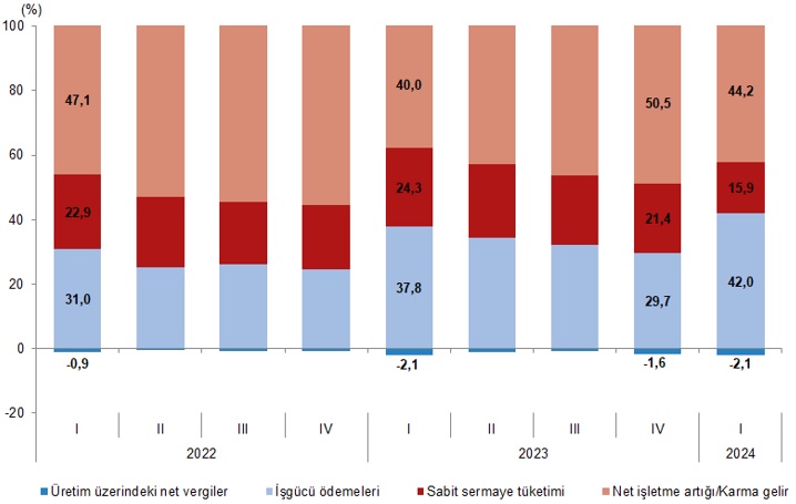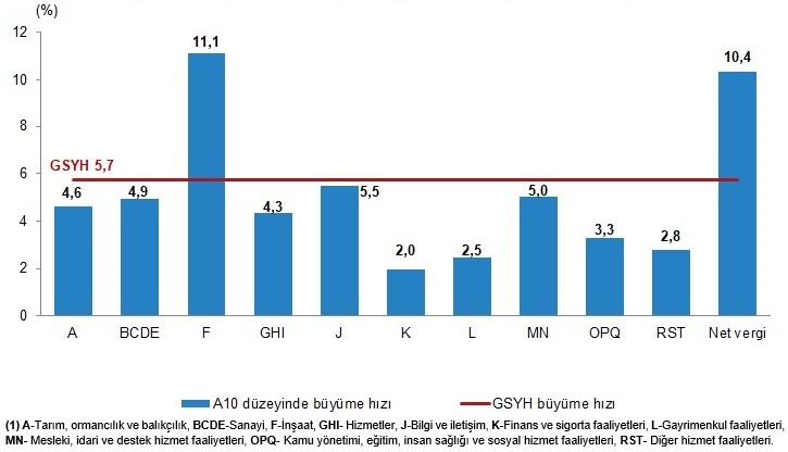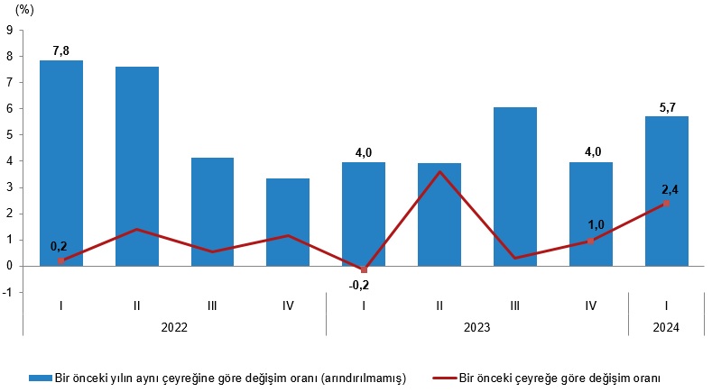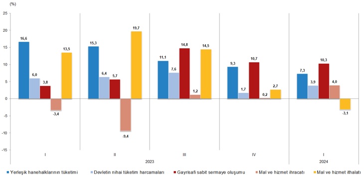 Türkiye İstatistik Kurumu (TÜİK), 2024 yılının ilk çeyreğine ilişkin Gayrisafi Yurt içi Hasıla verilerini açıkladı. TÜİK’in açıkladığı verilere göre ekonomi ilk çeyrekte yıllık bazda %5,7 büyüme kaydetti. Bu döneme ilişkin piyasaların genel beklentisi de %5,7 büyüme gerçekleşmesi yönündeydi. AA Finans'ın anket sonuçlarına göre ise ekonomistler bu yılın ilk çeyreğinde Türkiye ekonomisinin yıllık bazda %5,9 büyüdüğünü tahmin etmiş; ankete katılan ekonomistlerin beklentileri de %4,20 ile %7 aralığında yer almıştı. GSYH'yi oluşturan faaliyetler incelendiğinde; 2024 yılı birinci çeyreğinde bir önceki yıla göre zincirlenmiş hacim endeksi olarak; inşaat sektörü toplam katma değeri %11,1, bilgi ve iletişim faaliyetleri %5,5, mesleki, idari ve destek hizmet faaliyetleri %5,0, sanayi %4,9, tarım %4,6, hizmetler %4,3, kamu yönetimi, eğitim, insan sağlığı ve sosyal hizmet faaliyetleri %3,3, diğer hizmet faaliyetleri %2,8, gayrimenkul faaliyetleri %2,5 ve finans ve sigorta faaliyetleri %2,0 arttı. Kaynak: TÜİK Mevsim ve takvim etkilerinden arındırılmış GSYH zincirlenmiş hacim endeksi, bir önceki çeyreğe göre %2,4 arttı. Takvim etkisinden arındırılmış GSYH zincirlenmiş hacim endeksi, 2024 yılının birinci çeyreğinde bir önceki yılın aynı çeyreğine göre %5,8 arttı. Kaynak: TÜİK GSYH cari fiyatlarla 8,822 trilyon TL oldu Üretim yöntemiyle Gayrisafi Yurt İçi Hasıla tahmini, 2024 yılının birinci çeyreğinde cari fiyatlarla bir önceki yılın aynı çeyreğine göre %90,0 artarak 8 trilyon 822 milyar 248 milyon TL oldu. GSYH'nin birinci çeyrek değeri cari fiyatlarla ABD doları bazında 285 milyar 572 milyon olarak gerçekleşti. Hanehalkı nihai tüketim harcamaları %7,3 arttı Yerleşik hanehalklarının nihai tüketim harcamaları 2024 yılının birinci çeyreğinde bir önceki yılın aynı çeyreğine göre zincirlenmiş hacim endeksi olarak %7,3 arttı. Devletin nihai tüketim harcamaları %3,9, gayrisafi sabit sermaye oluşumu ise %10,3 arttı. Mal ve hizmet ihracatı %4,0 artarken ithalatı %3,1 azaldı Mal ve hizmet ihracatı, 2024 yılının birinci çeyreğinde bir önceki yılın aynı çeyreğine göre zincirlenmiş hacim endeksi olarak %4,0 artarken ithalatı %3,1 azaldı. Kaynak: TÜİK İşgücü ödemeleri %108,4 arttı İşgücü ödemeleri, 2024 yılının birinci çeyreğinde bir önceki yılın aynı çeyreğine göre %108,4 arttı. Net işletme artığı/karma gelir %107,8 arttı. İşgücü ödemelerinin cari fiyatlarla Gayrisafi Katma Değer içerisindeki payı geçen yılın birinci çeyreğinde %37,8 iken, bu oran 2024 yılı birinci çeyreğinde %42,0 oldu. Net işletme artığı/karma gelirin payı ise geçen yılın birinci çeyreğinde %40,0 iken, 2024 yılı birinci çeyreğinde %44,2 oldu. Kaynak: TÜİK Türkiye ekonomisi 2023'ün ilk çeyreğinde %4, ikinci çeyreğinde %3,9, üçüncü çeyreğinde %5,9, dördüncü çeyreğinde ise yüzde 4 büyüme kaydetmişti. Uzmanlar ise sıkılaşan para politikasına rağmen yerel seçim öncesi öne çekilen talebin birinci çeyrekteki ekonomik büyümeye katkı verdiğini ifade etmişti. [article_id:184]