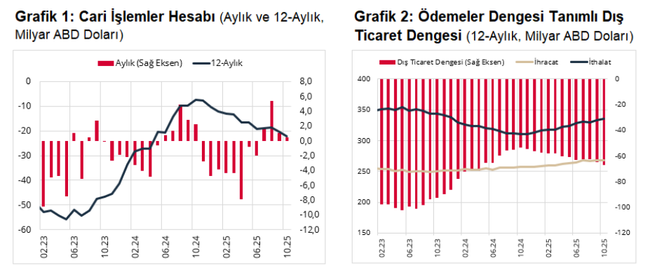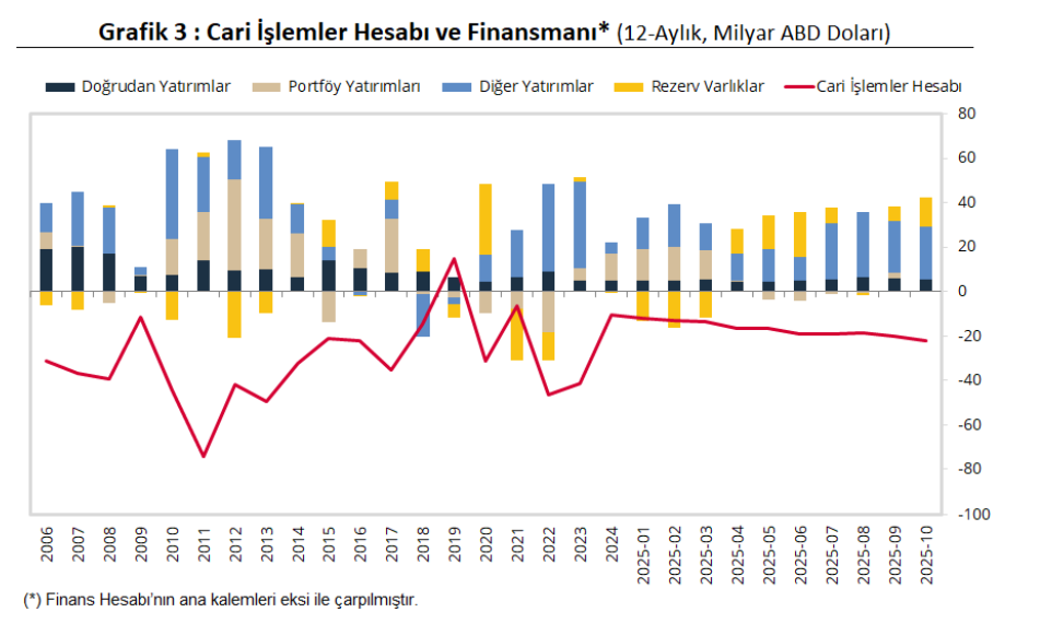 Türkiye'nin cari işlemler hesabı ekimde 457 milyon dolar, altın ve enerji hariç cari işlemler hesabı da 7 milyar 28 milyon dolar fazla verdi. Türkiye Cumhuriyet Merkez Bankası (TCMB) tarafından açıklanan ödemeler dengesi verilerine göre, Ekim 2025'te cari işlemler hesabında 457 milyon dolar, altın ve enerji hariç cari işlemler hesabında da 7 milyar 28 milyon dolarlık fazla oluştu. Bu dönemde, ödemeler dengesi tanımlı dış ticaret açığı 5 milyar 963 milyon dolar oldu. Yıllıklandırılmış verilere göre, ekim ayında cari açık yaklaşık 22 milyar dolar olurken, ödemeler dengesi tanımlı dış ticaret dengesi de 67,3 milyar dolar açık verdi. Aynı dönemde hizmetler dengesi 63,2 milyar dolar fazla verirken, birincil ve ikincil gelir dengesi sırasıyla 17,6 milyar dolar ve 328 milyon dolar açık verdi. Hizmetler dengesi kaynaklı net girişler bu ay 7 milyar 588 milyon dolar seviyesinde gerçekleşirken, bu kalem altında taşımacılık hizmetleri ve seyahat kaleminden kaynaklanan net gelirler sırasıyla 2 milyar 462 milyon dolar ve 5 milyar 860 milyon dolar oldu. Ekim ayı yıllıklandırılmış cari açığın finansmanına net doğrudan yatırımlar 5,2 milyar dolar, net portföy yatırımları 0,2 milyar dolar, krediler 26,9 milyar dolar ve ticari krediler 0,8 milyar dolar katkı verirken; net efektif ve mevduatlar 3,9 milyar dolar negatif yönlü etki etti. Merkez Bankası döviz cinsinden net rezerv azalışı 13,3 milyar dolar oldu. Kaynak: TCMB [news_id:794685]