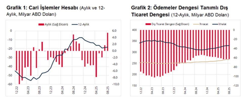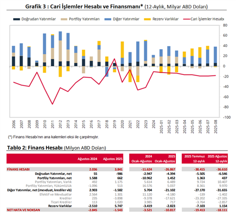 TCMB verilerine göre cari denge ağustos ayında 5 milyar 455 milyon dolar ile art arda ikinci ayda da cari fazla verdi. Türkiye Cumhuriyet Merkez Bankası (TCMB) ağustos ayı ödemeler dengesi verilerini açıkladı. TCMB verilerine göre cari denge ağustos ayında 5 milyar 455 milyon dolarlık fazla verdi. Temmuz ayında da 1 milyar 705 milyon dolarlık cari fazla verilmişti. AA Finans anketine katılan ekonomistler ise cari işlemler hesabının ağustos ayında 5 milyar 472 milyon dolar fazla vermesini bekliyordu. Ekonomistler, cari işlemler açığının 2025 yılında ise 21 milyar 125 milyon dolar olarak gerçekleşeceği tahmininde bulunmuştu. Cari açık 8 ayda 15 milyar dolar açık verdi Cari işlemler hesabı ocak-ağustos döneminde ise 15,85 milyar dolar açık verdi. Geçen yıl aynı dönemde açık 8 milyar dolardı. 12 aylık dönemde ise cari açık 18,28 milyar dolar oldu. 8 ayda 11 milyar dolara yakın kaynağı belirsiz para çıkışı Kaynağı belirsiz para giriş ve çıkışlarını gösteren net hata noksan kalemi ağustosta -1,54 milyar dolar, ocak-ağustos döneminde -10,82 milyar dolar oldu. Geçen yıl 8 aylık dönemde bu kalem -3,5 milyar dolar düzeyindeydi. Kaynak: TCMB