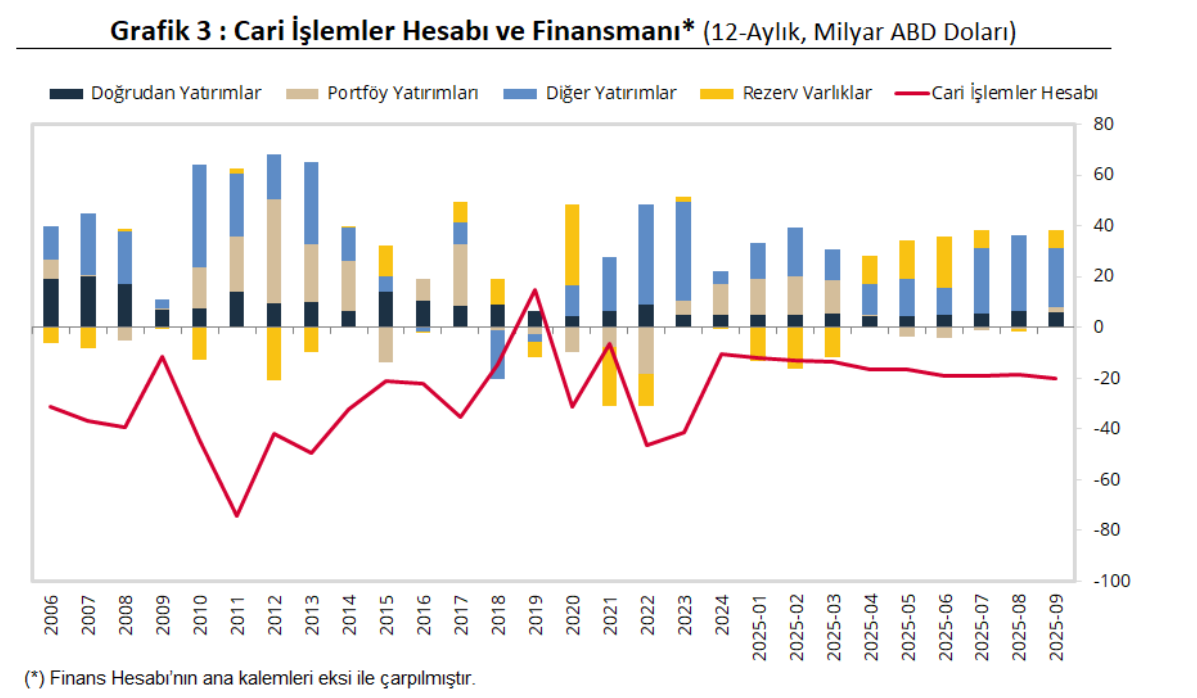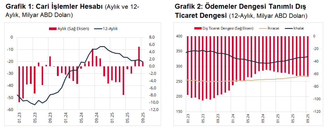 TCMB verilerine göre cari denge eylül ayında 1 milyar 112 milyon dolar ile art arda üçüncü ayda da cari fazla verdi. Türkiye Cumhuriyet Merkez Bankası (TCMB) eylül ayı ödemeler dengesi verilerini açıkladı. TCMB verilerine göre cari denge eylül ayında 1 milyar 112 milyon dolarlık fazla verdi. Altın ve enerji hariç cari işlemler hesabı ise 6.803 milyon dolar fazla verdi. Ödemeler dengesi tanımlı dış ticaret açığı 5.356 milyon dolar olarak gerçekleşti. Yıllıklandırılmış verilere göre, eylül ayında cari açık yaklaşık 20,1 milyar dolar, ödemeler dengesi tanımlı dış ticaret açığı da 64,8 milyar dolar oldu. Aynı dönemde hizmetler dengesi 62,6 milyar dolar fazla verirken, birincil ve ikincil gelir dengesi sırasıyla 17,6 milyar dolar ve 308 milyon dolar açık verdi. Hizmetler dengesi kaynaklı net girişler bu ay 7.707 milyon dolar seviyesinde gerçekleşirken, bu kalem altında taşımacılık hizmetleri ve seyahat kaleminden kaynaklanan net gelirler sırasıyla 2.269 milyon dolar ve 6.259 milyon dolar oldu. Finans hesabı 2025 yılı Eylül ayı yıllıklandırılmış cari açığın finansmanına net doğrudan yatırımlar 5,7 milyar dolar, net portföy yatırımları 2,0 milyar dolar, krediler 22,8 milyar dolar ve ticari krediler 1,9 milyar dolar katkı verirken; net efektif ve mevduatlar 1,1 milyar dolar negatif yönlü etki etti. Merkez Bankası döviz cinsinden net rezerv azalışı 6,8 milyar dolar oldu. Kaynak: TCMB