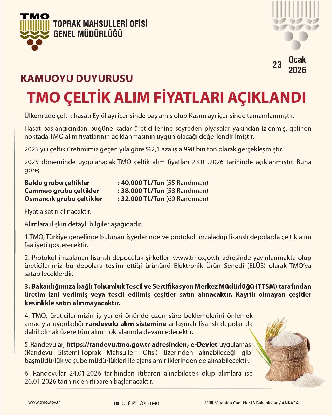 Toprak Mahsulleri Ofisi (TMO), çeltik alım fiyatını baldo grubu için ton başına 40 bin lira, cammeo grubu için 38 bin lira, Osmancık grubu için 32 bin lira olarak belirledi. TMO'nun internet sitesinde yer alan açıklamada, Türkiye'de çeltik hasadının eylül ayı içinde başlayıp, kasımda tamamlandığı hatırlatılarak, hasat başlangıcından bugüne kadar üretici lehine seyreden piyasaların yakından izlendiği ve gelinen noktada alım fiyatlarının açıklanmasının uygun olacağının değerlendirildiği bildirildi. Geçen yıl çeltik üretiminin, 2024'e göre yüzde 2,1 azalışla 998 bin ton olarak gerçekleştiği anımsatılan açıklamada, "Baldo grubu çeltikler için ton başına 40 bin lira (55 randıman), cammeo grubu için 38 bin lira (58 randıman), Osmancık grubu için ise 32 bin lira (60 randıman) fiyatla satın alınacaktır." ifadeleri yer aldı. Alımlara ilişkin detayların paylaşıldığı açıklamada, TMO'nun Türkiye genelinde bulunan iş yerlerinde ve protokol imzaladığı lisanslı depolarda, çeltik alım faaliyeti göstereceği kaydedildi. Protokol imzalanan lisanslı depoculuk şirketlerinin "www.tmo.gov.tr" adresinde yayımlandığı, üreticilerin bu depolara teslim ettiği ürününü Elektronik Ürün Senedi (ELÜS) olarak TMO'ya satabileceğine işaret edilen açıklamada, "Bakanlığımıza bağlı Tohumluk Tescil ve Sertifikasyon Merkez Müdürlüğü (TTSM) tarafından üretim izni verilmiş veya tescil edilmiş çeşitler, satın alınacak. Kayıtlı olmayan çeşitler, kesinlikle satın alınmayacak." bilgisi paylaşıldı. "Alımlara 26 Ocak'tan itibaren başlanacak" TMO'nun, üreticilerin iş yerleri önünde uzun süre beklemelerini önlemek amacıyla uyguladığı randevulu alım sistemine, anlaşmalı lisanslı depolar da dahil olmak üzere, tüm alım noktalarında devam edeceğine dikkat çekilerek, şunlar kaydedildi: "Randevular, 24 Ocak'tan itibaren 'https://randevu.tmo.gov.tr' adresinden, e-Devlet uygulaması (Randevu Sistemi-Toprak Mahsulleri Ofisi) üzerinden alınabileceği gibi başmüdürlük ve şube müdürlükleri ile ajans amirliklerinden de alınabilecek. Çeltik alımlarına, 26 Ocak'tan itibaren başlanacak. Ürün bedeli ödemeleri, ürün teslimatına müteakip 30 gün içinde, üreticilerin banka hesaplarına aktarılacak. Bakanlığımızca üreticilerimize, ilave olarak temel destek ve sertifikalı tohum kullanım desteği ödenecek. TMO tarafından, üreticilerin ÇKS'de kayıtlı üretim miktarının tamamı satın alınabilecek. TMO iş yerlerine satılan ürünün borsa tescil ücreti, TMO tarafından karşılanacak. Geçici alım merkezlerinde, hizmet bedeli kesintisi (yüzde 1) yapılacak. Damperli araçlardan, boşaltma ücreti alınmayacak."