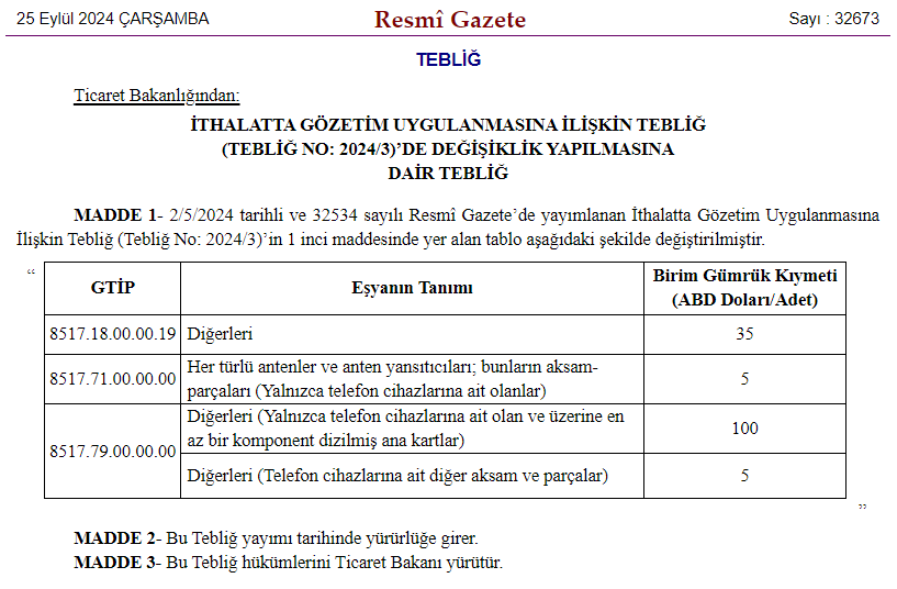 Ticaret Bakanlığı, cep telefonu üretiminde kullanılan üzerine en az bir komponent dizilmiş kartların gözetim kapsamından çıkarıldığını duyurdu. Resmi Gazete'nin bugünkü sayısında yayımlanan ithalatta gözetim uygulanmasına ilişkin tebliğde değişiklik yapılmasına ilişkin tebliğle, Mayıs ayında birim gümrük kıymeti 100 doların altında olan ana kartlar da dahil olmak üzere üzerine en az bir komponent dizilmiş cep telefonu üretiminde kullanılan kartlara yönelik uygulamaya konulan gözetim önleminde düzenlemeye gidildi. Buna göre, cep telefonu üretimine ait, birim gümrük kıymeti 100 dolar/adet altında olan üzerine en az bir komponent dizilmiş ana kartlar gözetim belgesiyle ithal edilebilecek. Gözetim kapsamında bu cinsten diğer kartlar yer alamayacak. Kaynak: Resmi Gazete