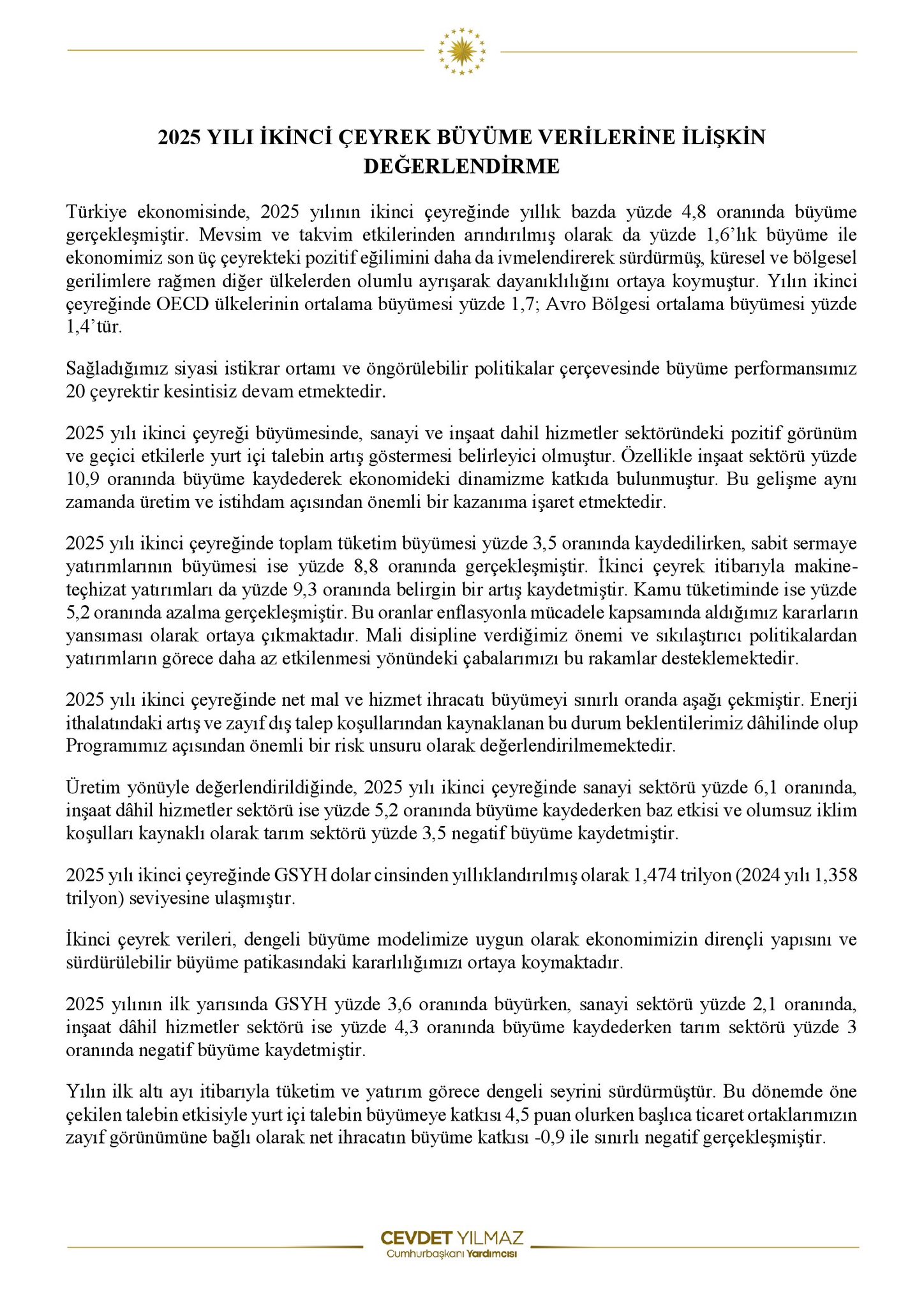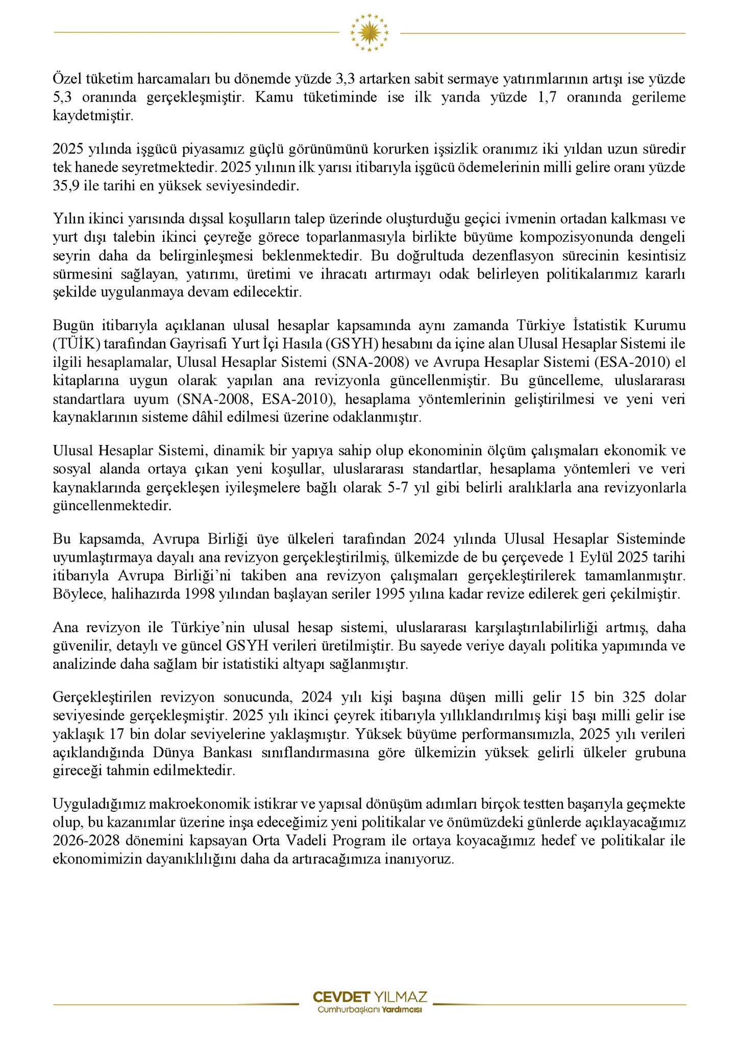 Türkiye ekonomisinin sürpriz büyüme rakamlarının ardından açıklamada bulunan Cumhurbaşkanı Yardımcısı Cevdet Yılmaz, “Yüksek büyüme performansımızla, 2025 yılı verileri açıklandığında ülkemizin yüksek gelirli ülkeler grubuna gireceğini tahmin ediyoruz” dedi. Cumhurbaşkanı Yardımcısı Cevdet Yılmaz, sosyal medya platformu X üzerinden yaptığı paylaşımda, küresel ekonomide talep koşullarının zayıfladığı ve belirsizliklerin arttığı bir dönemde Türkiye’nin büyümesini sürdürdüğünü belirtti. Son verilere göre milli gelirin 1,5 trilyon dolara, kişi başı milli gelirin ise 17 bin dolara yaklaştığını ifade eden Yılmaz, şunları aktardı: “Dünya ekonomisindeki dış talep koşullarının zayıfladığı ve belirsizliklerin arttığı bu ortamda ekonomimizin dinamizmi sürmekte, milli gelirimiz artmaya devam etmektedir. Ekonomimiz, 2025 yılının ikinci çeyreğinde yıllık bazda yüzde 4,8; mevsim ve takvim etkilerinden arındırılmış olarak da bir önceki çeyreğe göre yüzde 1,6 oranında büyümüştür. Böylece, 2025 yılı ikinci çeyrek itibarıyla milli gelirimiz 1,5 trilyon dolara; kişi başı milli gelirimiz ise 17 bin dolar seviyesine yaklaşmıştır. Yüksek büyüme performansımızla, 2025 yılı verileri açıklandığında Dünya Bankası sınıflandırmasına göre ülkemizin yüksek gelirli ülkeler grubuna gireceğini tahmin ediyoruz. Programımızda öngördüğümüz şekilde enflasyonla kararlı şekilde mücadele ederken dengeli büyüme politikalarımızı sürdüreceğiz. Hazırlıklarını titizlikle yürüttüğümüz ve önümüzde günlerde açıklayacağımız güncellenmiş OVP ile politikalarımızı bütüncül bir çerçevede hayata geçirmeye devam edeceğiz.” Kaynak: Cevdet Yılmaz